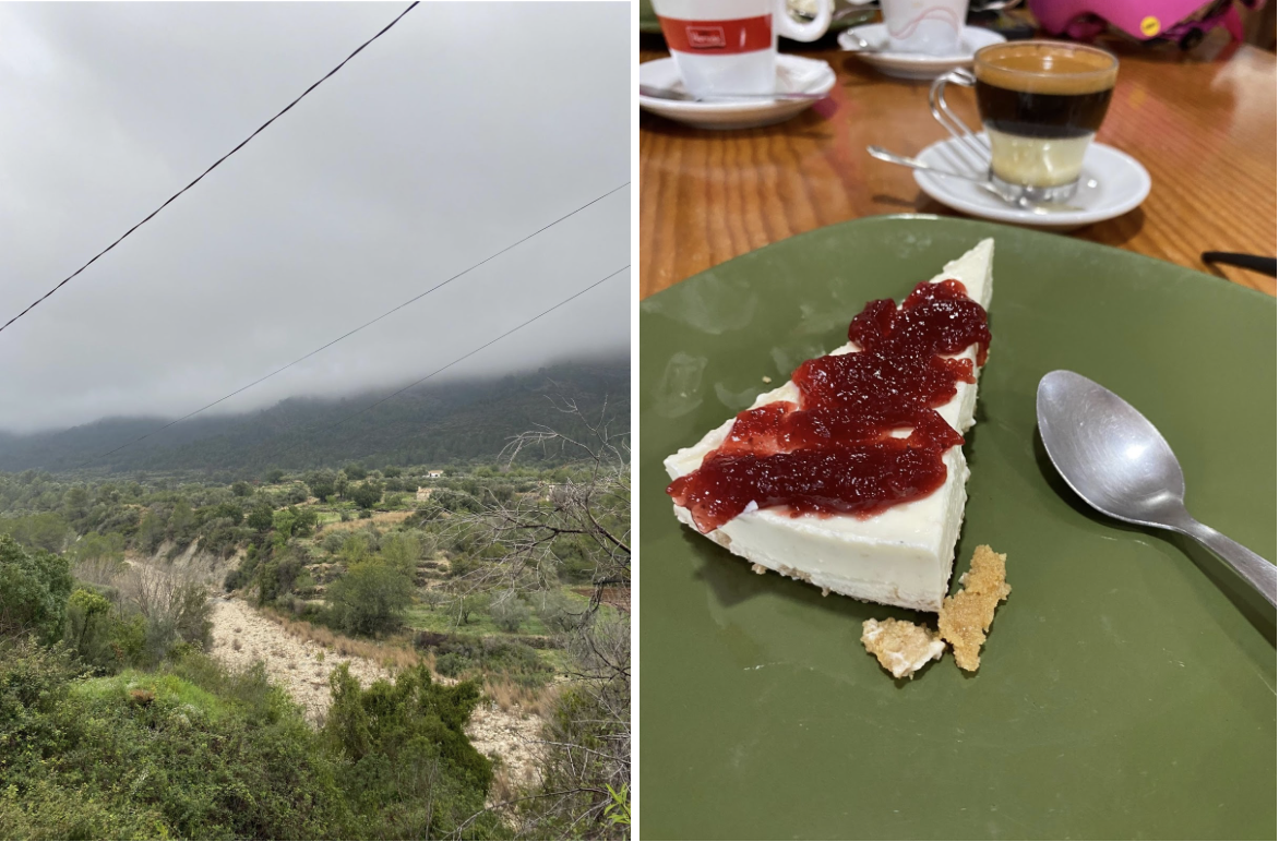 V Pego sme natrafili na otvorenú kaviareň (jednu z mála). Sadli sme si za stôl s mokrými vložkami v kraťasoch, ale šťastní, pretože sme si objednali bon bon a teplý jablkový koláč. Po krátkej prestávke sme pokračovali späť do hotela a cestou na chvíľu vykuklo slnko! Pripomenulo nám, že aj v horších chvíľach sa objavia okamihy radosti.