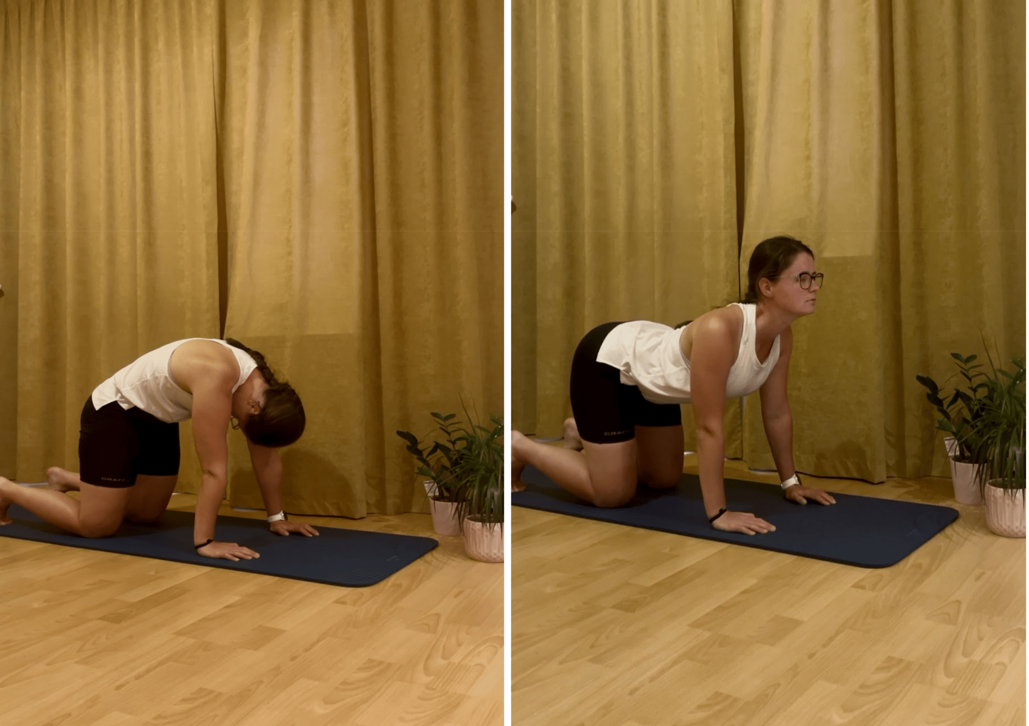 - Cat-cow – mačací chrbát, mobilizuje chrbticu a trup. Na štyroch striedavo vyhrbuj a prehýbaj chrbát.