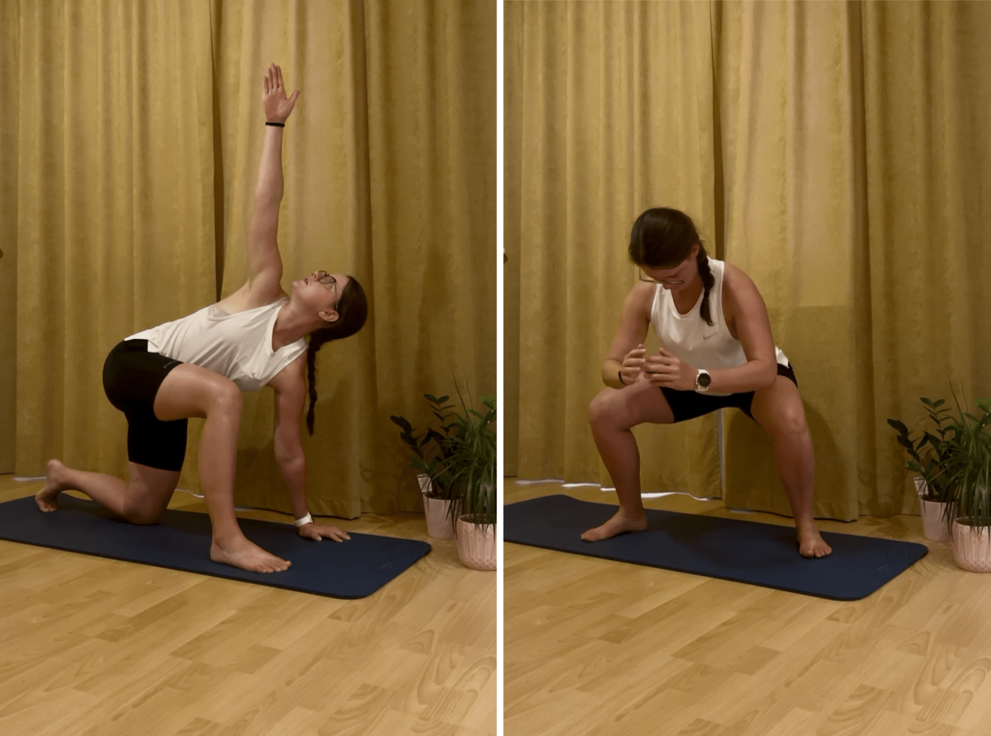 - Výpad s rotáciou – mobilizuje bedrá a hrudnú chrbticu. Začni vo výpade, jednu ruku opieraj o podložku a druhou rotuj trup smerom hore, sleduj dlaň pohľadom.