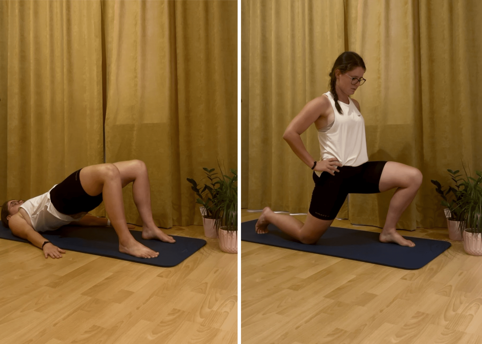 - Hip flexor stretch – výpad vpred, zadná noha pokrčená na kolene, predná do 90°, panvu jemne zatlač dopredu.