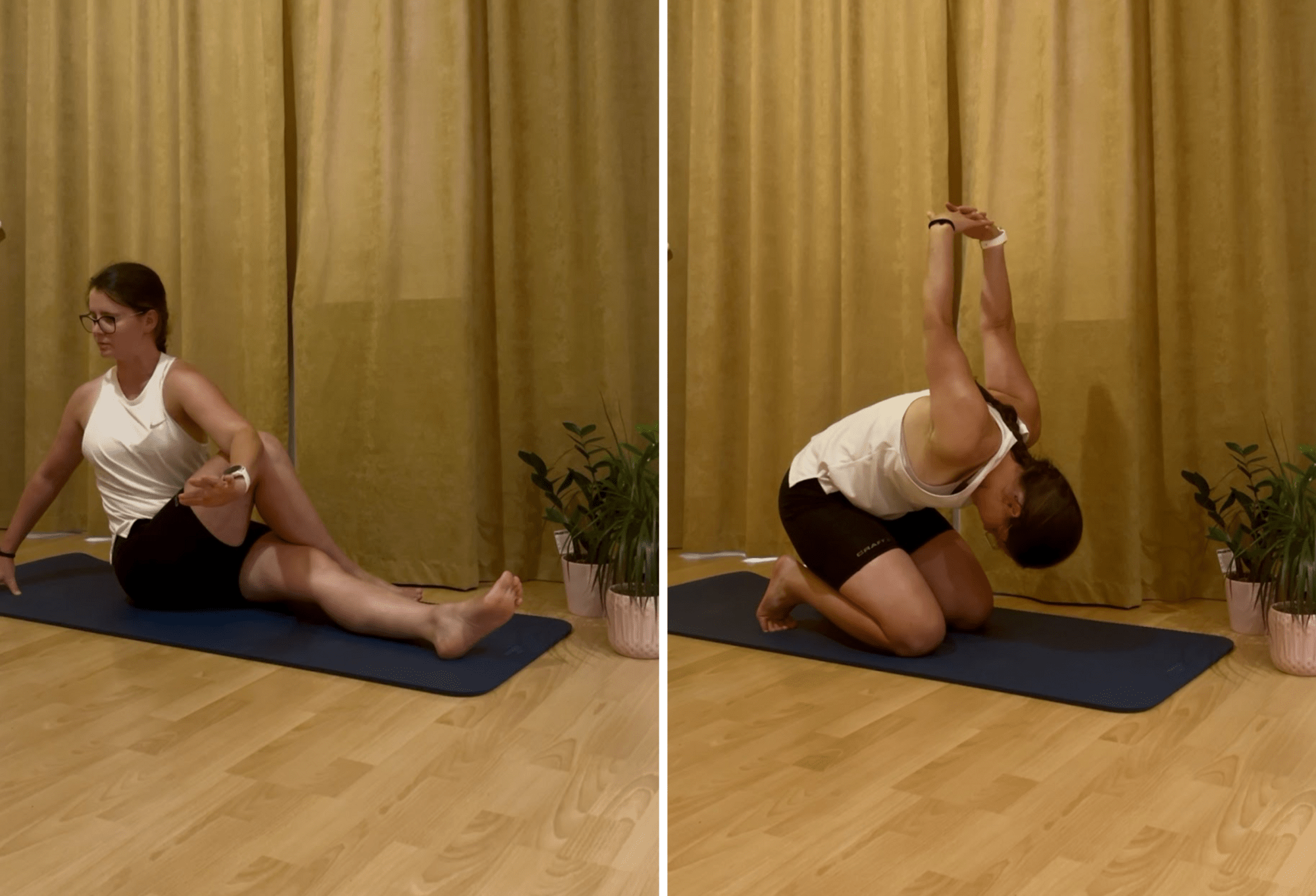 - Glute stretch – sadni si, pokrč jednu nohu cez druhú, trup jemne otoč smerom k pokrčenej nohe.