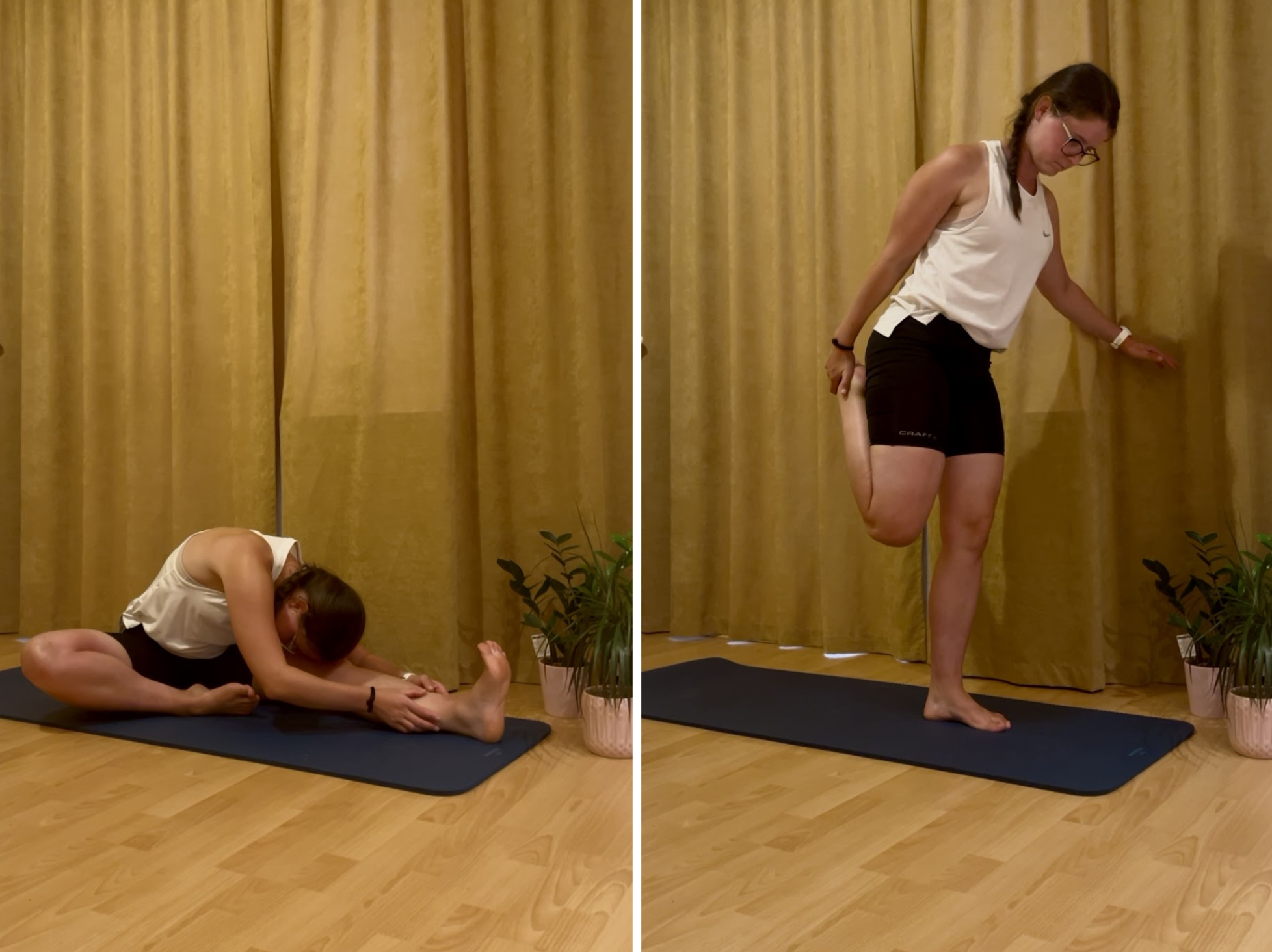 - Quadriceps stretch – stoj, jednu nohu pokrč za sebou, drž členok rukou, koleno smeruje k zemi, panvu mierne zatlač dopredu.