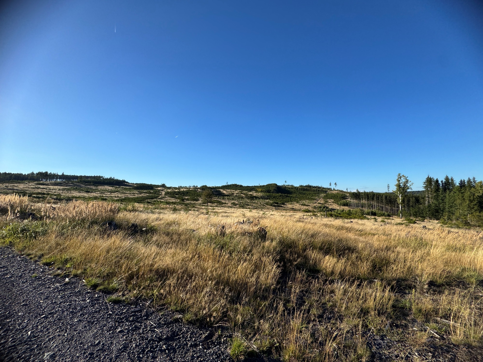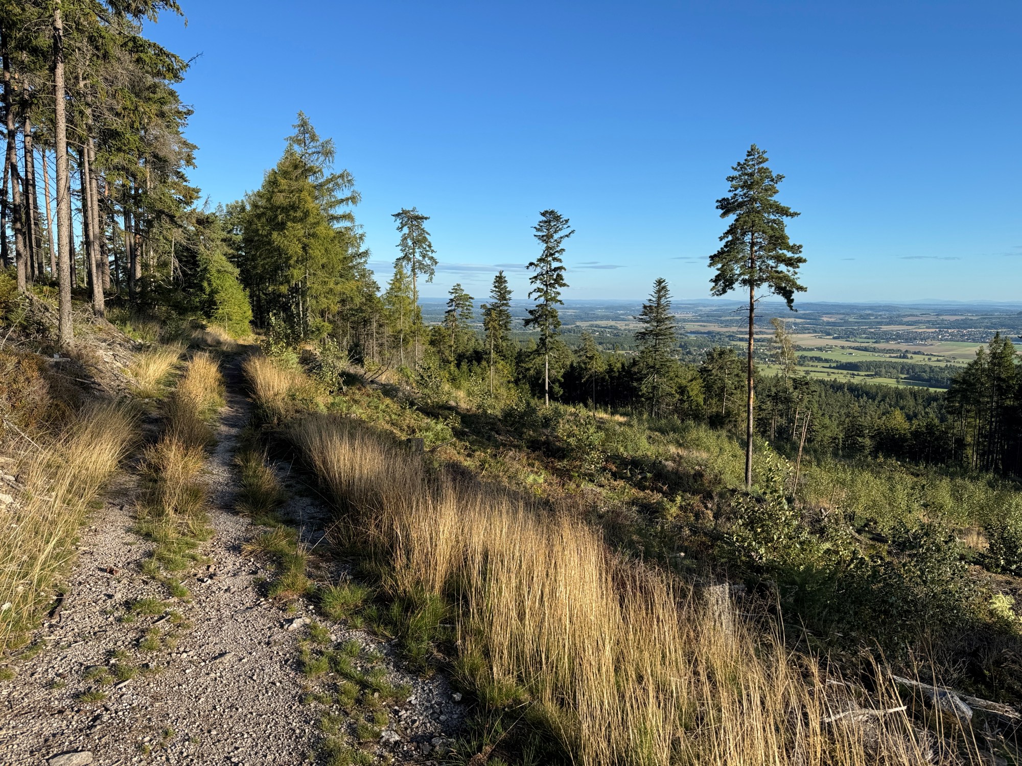 Trasa sa mení na šotolinu a na computeri nabiehajú sklony okolo 10 %. Slniečko ale má úžasnú moc, a tak šliapanie do kopca len umocňuje nádherný pocit septembrového podvečera. Hoci Brdy prešli pred pár rokmi silnú podkôrnikovú kalamitu a kvôli výrubu a ťažbe dreva vzniklo mnoho čistín, tak sa teraz všetko vracia do „normálu“. Plochy sa zelenajú a na mnohých miestach, ktoré predtým obklopovali stromy, sa zrazu zjavujú krásne otvorené scenérie.