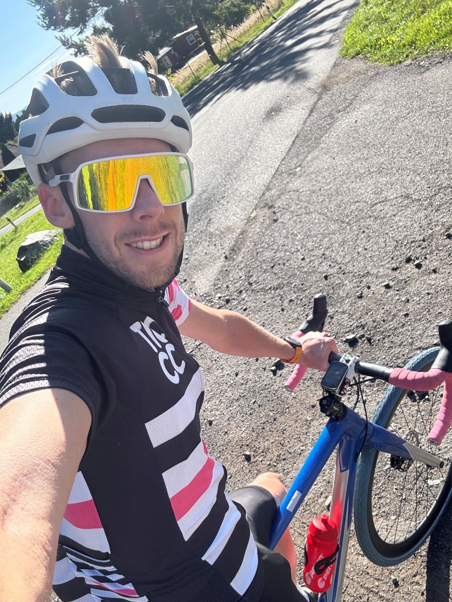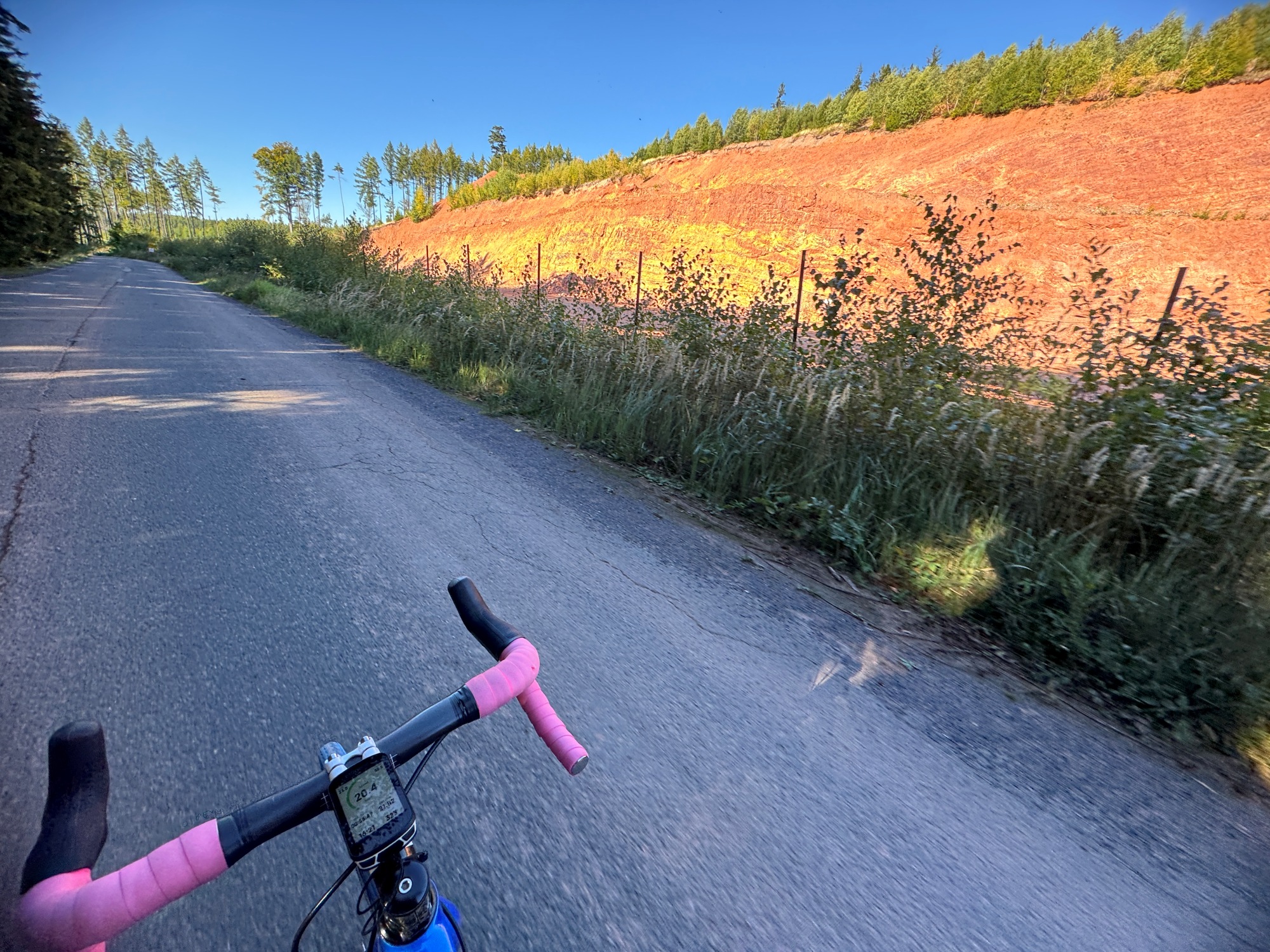 Po 200 m odbočujeme doľava a začíname klesať. Celkovo som trasu naplánoval iba spevneným, či ľahkým nespevneným terénom, takže ideálny pre populárny gravel. Ja som dnes osedlal svoj cyklokrosový bicykel, obutý na širšie univerzálne plášte v modrom odtieni. Pekne to letí!