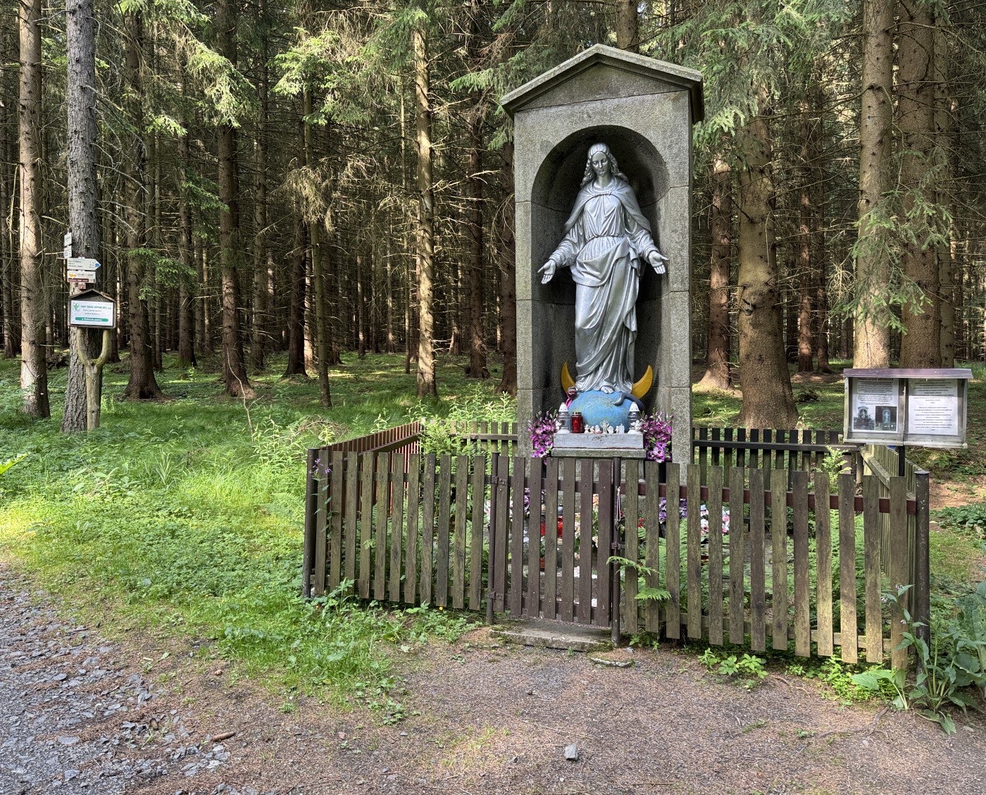 Mierny zjazd a potom dlhý, celkom rovný úsek peknej lesnej cesty, na ktorej jazda pekne ubieha. Les vonia hubami - asi už začínajú rásť. Krátke stúpanie a potom klesanie. Smreky okolo hustnú a mierne znižujú viditeľnosť, keď tu sa pred nami objaví čistina. Socha Panny Márie Březnickej, ktorú komunistický režim označoval hrozivo ako „Železná panna.“ Veľké šťastie, že táto pamiatka prežila až do dnešných dní.
