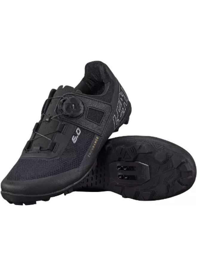 Buty wytrzymałościowe (XC i żwir) z światłem i półprzezroczystą polimerową górną częścią włókien. W 100 % nylonowe wzmocnienie w podeszwie zapewnia większą elastyczność niż wersja węglowa, dzięki czemu buty są wygodniejsze do spacerów. Podeszwa jest wykonana z gumy Ridegrip z agresywnym bieżnikiem, co ułatwia wejście w mokre warunki poza rower. Rozszerzone rowki bagażnika umożliwiają większy zakres regulacji. Mod/LEATT systemu sznurowania jednego punktu umożliwia szybką i dokładną adaptację. Specjalny materiał kierunkowy na pięcie naprawia nogę i zapobiega poślizgnięciu się nawet po dokręceniu.