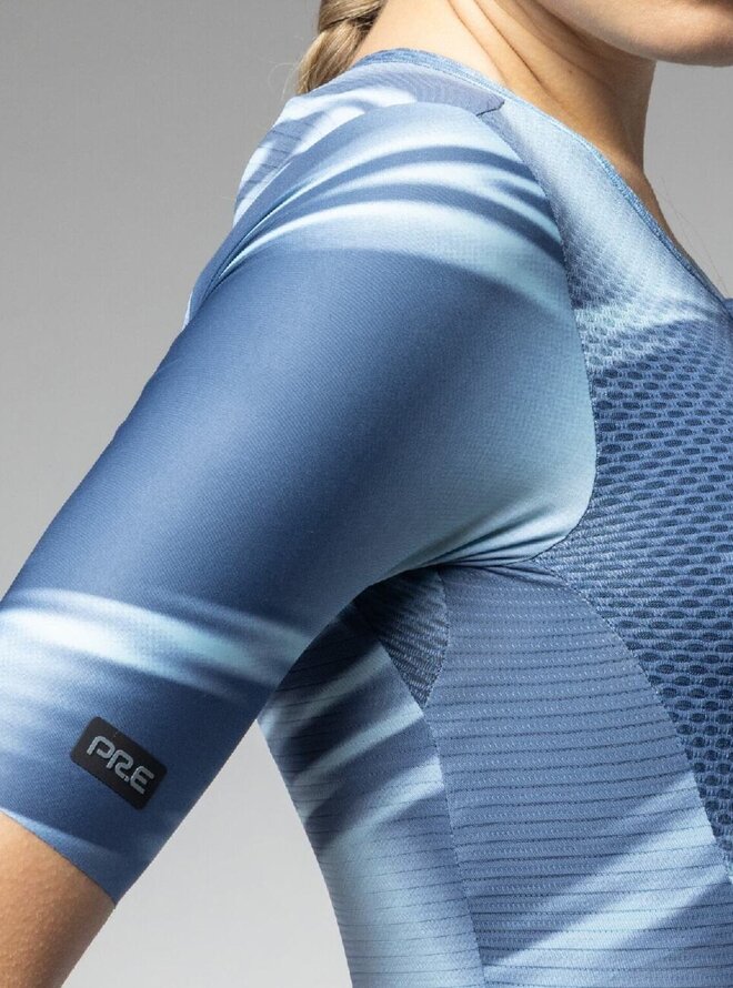 Lekki i wysoce oddychający kombinezon Techno PR-E łączy w sobie wygodę, wydajność i styl w jednym, wyrafinowanym technicznie elemencie. Lekki i oddychający materiał skutecznie odprowadza wilgoć i utrzymuje skórę suchą nawet przy dużym obciążeniu, a anatomiczny krój szanuje kobiecą sylwetkę. Całkowicie otwarty top ułatwia zakładanie, a schludne spodenki kompresyjne wspierają mięśnie, zmniejszają zmęczenie i zapewniają maksymalną swobodę ruchów.