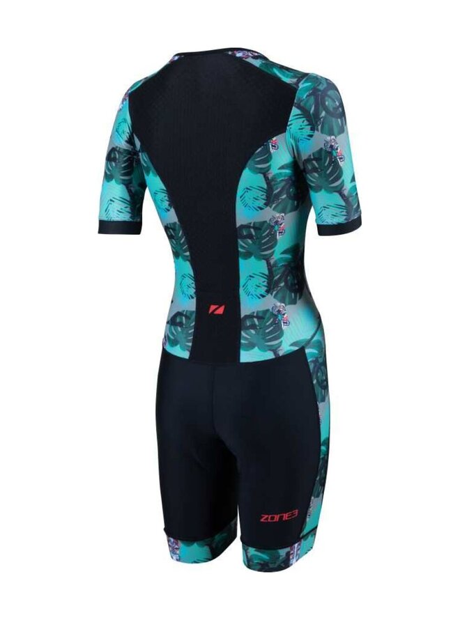 Damski kombinezon triathlonowy Zone3 Activate+ z krótkim rękawem to wysokiej jakości kombinezon triathlonowy przeznaczony dla sportsmenek, które oczekują niezawodnej wydajności, komfortu i stylowego wyglądu podczas treningów i wyścigów. Model ten należy do serii Activate+, która łączy w sobie wysokiej jakości materiały, detale techniczne i ergonomiczny krój odpowiedni dla wszystkich trzech dyscyplin triathlonowych – pływania, jazdy na rowerze i biegania. Panele przednie i spodnie wykonane są z wydajnych tkanin pochodzących z recyklingu, które zapewniają optymalne dopasowanie, odprowadzanie wilgoci i szybkie suszenie, natomiast tylny panel z siateczki zwiększa oddychalność i komfort podczas intensywnych treningów. Krótkie rękawy zapewniają lepszą osłonę i aerodynamikę, nie krępując ruchów. Kombinezon tri-suit wyposażony jest w ergonomicznie umieszczoną wkładkę Tri-Lite, która zapewnia komfort podczas jazdy na rowerze bez ograniczeń podczas biegania czy pływania. Silikonowe uchwyty utrzymują spodnie stabilnie na swoim miejscu, zamek błyskawiczny z przodu umożliwia łatwe zakładanie i regulację wentylacji, a elastyczna kieszeń z tyłu oferuje praktyczne miejsce na żele energetyczne lub drobne przedmioty podczas wyścigu.Szczegóły