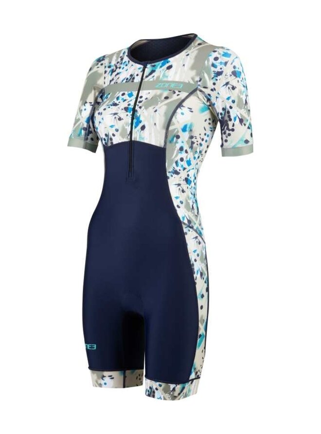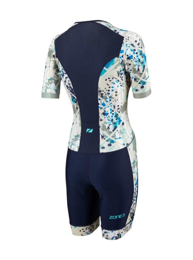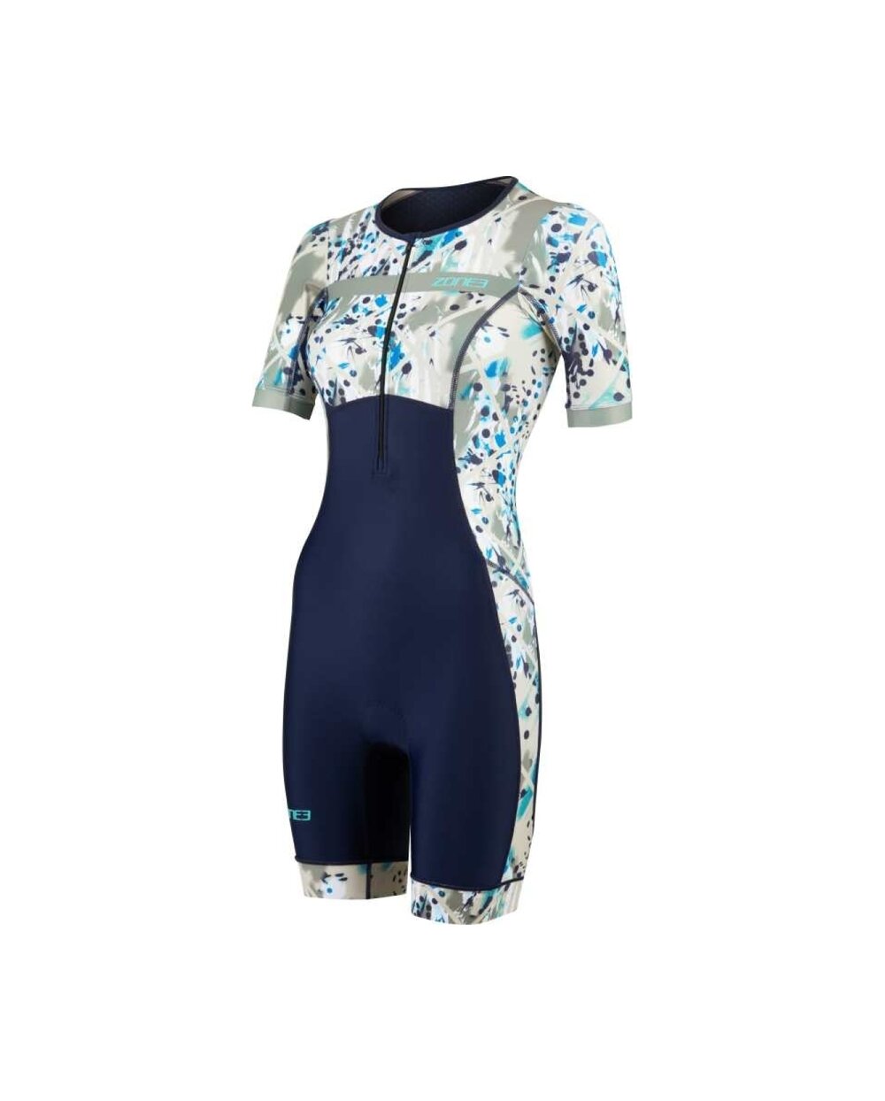 Damski kombinezon triathlonowy Zone3 Activate+ z krótkim rękawem to techniczny kombinezon triathlonowy przeznaczony dla sportsmenek ceniących połączenie wydajności, komfortu i trwałości. Model ten bazuje na popularnej linii Activate+, która oferuje wysokiej jakości materiały, funkcjonalne detale i nowoczesny design odpowiedni na treningi i wyścigi. Kombinezon triathlonowy wykonany jest w 100% z materiałów pochodzących z recyklingu, które zapewniają wysoką elastyczność, dobre odprowadzanie wilgoci i szybkie schnięcie od pierwszego momentu wykonania. Z tyłu znajduje się panel z siateczki pochodzącej z recyklingu, która poprawia oddychalność i utrzymuje chłód ciała nawet podczas dużych obciążeń. Ergonomicznie rozmieszczona wkładka Tri-Lite zapewnia wygodę podczas kolarskiej części wyścigu, nie ograniczając biegania ani pływania, a silikonowe uchwyty UFO pochodzące z recyklingu utrzymują spodnie bezpiecznie na miejscu bez niepożądanych ruchów. Kombinezon wyposażony jest w przedni zamek błyskawiczny ułatwiający zakładanie i wydajniejszą wentylację oraz tylną elastyczną kieszeń na żele energetyczne lub drobne przedmioty osobiste. Stylowy, kontrastujący kolor Sand Storm/Navy-Sand nadaje tej kombinacji nowoczesny, sportowy wygląd i jest idealny dla triatlonistów poszukujących niezawodnych osiągów i komfortu w każdej dyscyplinie.Szczegóły