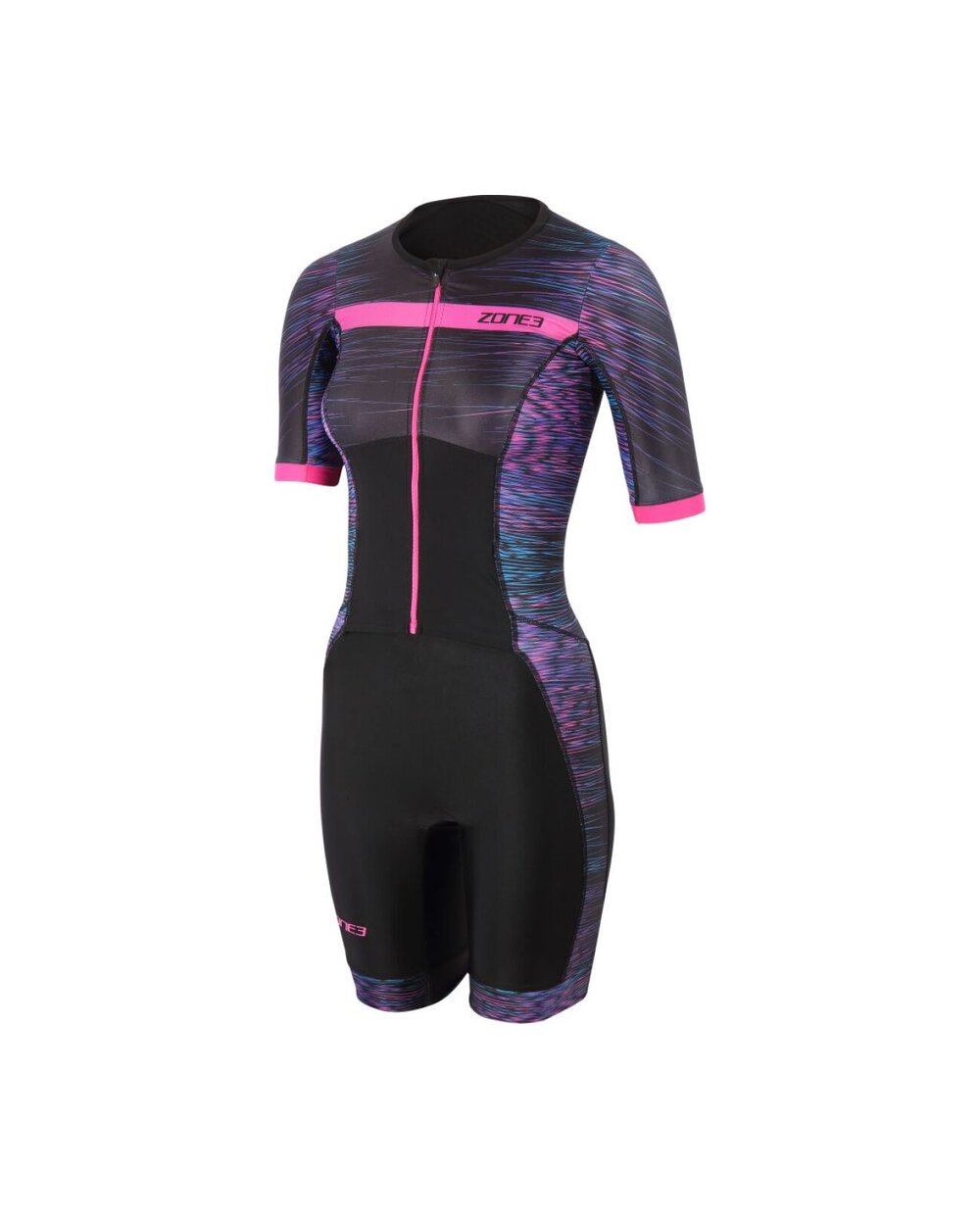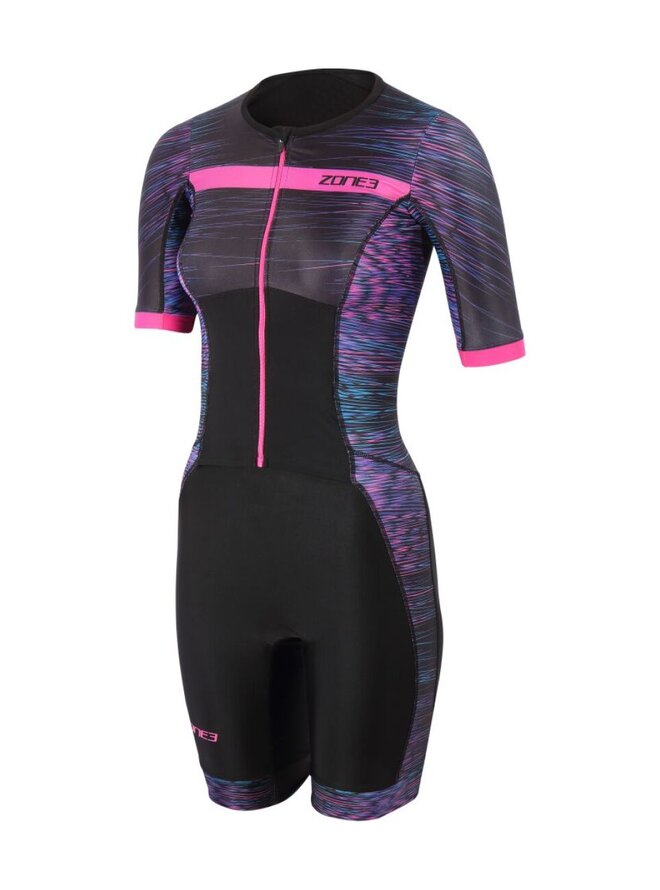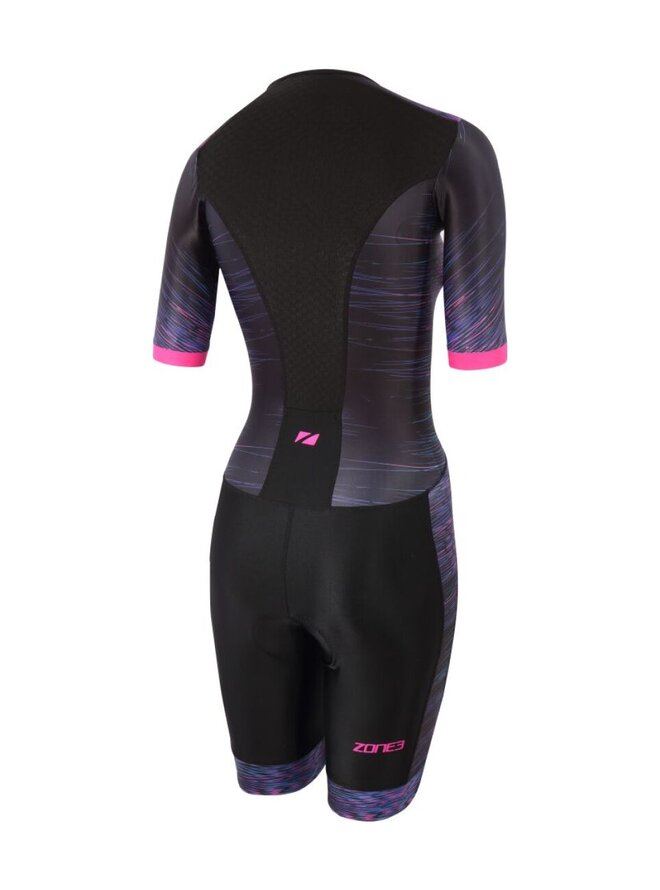 Damski kombinezon triathlonowy Zone3 Activate+ Momentum z krótkim rękawem i zamkiem błyskawicznym to wszechstronny kombinezon triathlonowy zaprojektowany, aby zapewnić niezawodną wydajność, wygodę i nowoczesny styl podczas treningów i wyścigów. Model ten należy do kolekcji Activate+ – ulepszonej wersji popularnej linii Activate, która łączy w sobie wysokiej jakości materiały, parametry techniczne i sportowy design. Kombinezon wykonany jest z wysoce elastycznej tkaniny Lycra Sport w przedniej części tułowia i nogawek, która zapewnia optymalną przyczepność, osłonę i odprowadzanie wilgoci, podczas gdy tylny panel wykorzystuje lekki, bardzo elastyczny materiał waflowy, zapewniający maksymalną oddychalność i komfort podczas występów w cieplejszych warunkach. Krótkie rękawy zapewniają lepszą osłonę i aerodynamikę, nie krępując ruchów, a ergonomiczny krój podkreśla kobiecą sylwetkę i zapewnia wygodne dopasowanie, bez uciskania i uciskania. Zamek błyskawiczny z przodu na całej długości umożliwia łatwe ubieranie, a jednocześnie służy jako wentylacja podczas intensywnych obciążeń. Kombinezon triathlonowy ma wyściółkę Tri-Lite Performance, która została zaprojektowana tak, aby zminimalizować podrażnienia i zwiększyć komfort podczas jazdy na rowerze, nie wpływając negatywnie na bieganie ani pływanie. Praktyczna, elastyczna kieszeń tylna zapewnia miejsce do przechowywania żeli energetycznych lub drobnych przedmiotów osobistych, a silikonowe uchwyty UFO na spodniach zapewniają stabilne trzymanie spodni bez niepożądanych ruchów.Szczegóły