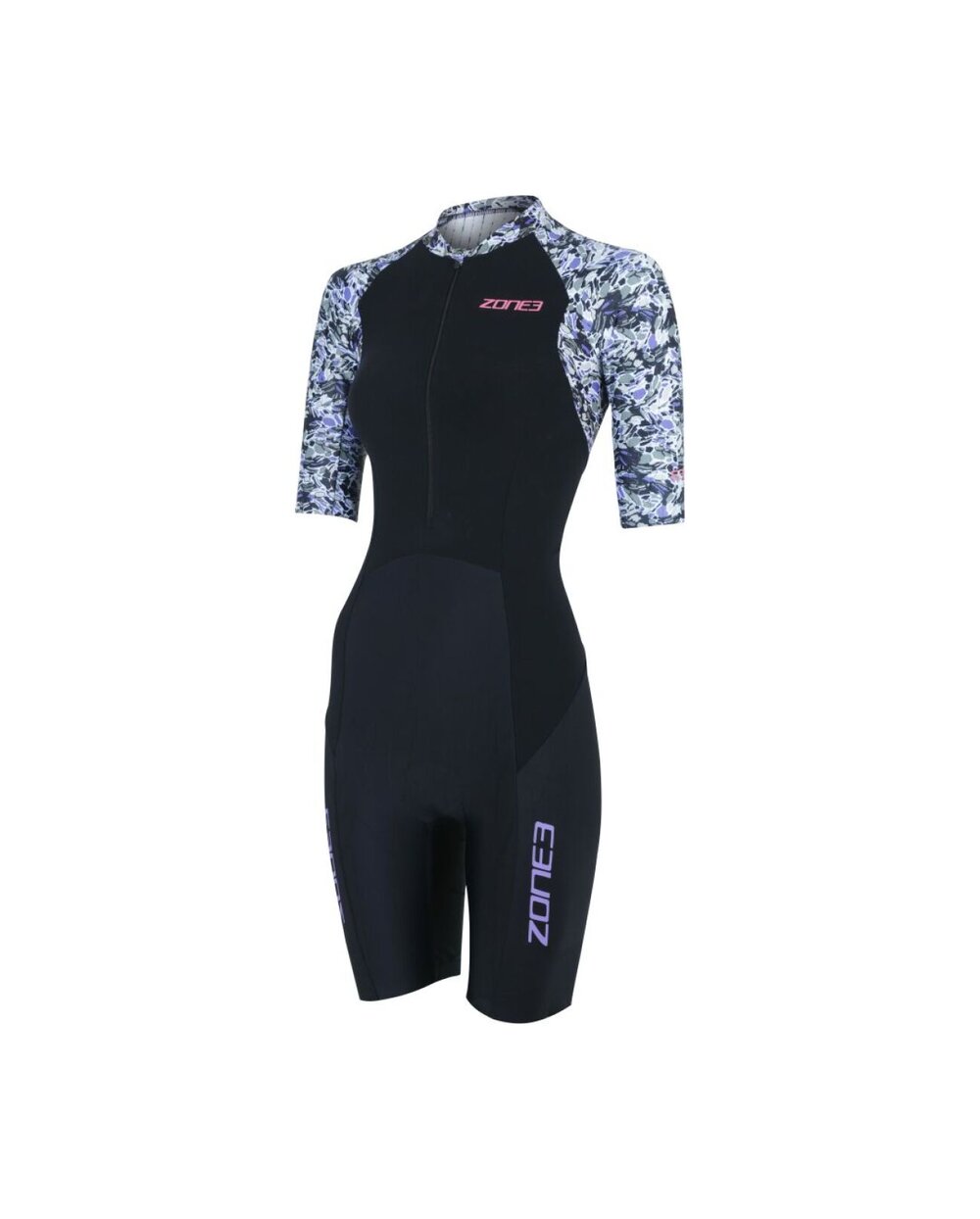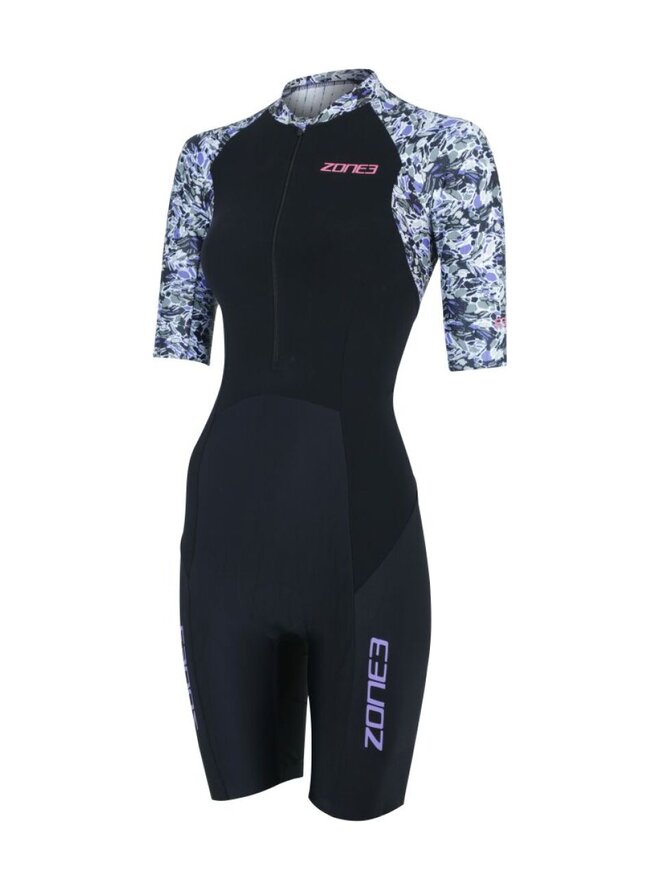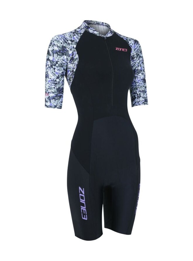 Zone3 Lava Trisuit z krótkim rękawem to damski kombinezon triathlonowy klasy premium przeznaczony do wymagających wyścigów i dłuższych sesji treningowych. Model ten pochodzi z wielokrotnie nagradzanej kolekcji Lava, która jest efektem długotrwałych prac rozwojowych i testów w tunelu aerodynamicznym oraz wśród zawodowych sportowców. Kombinezon triathlonowy Lava łączy w sobie zaawansowane panele aerodynamiczne, hydrofobowe wykończenia i materiały techniczne, które razem poprawiają wydajność we wszystkich trzech dyscyplinach – pływaniu, jeździe na rowerze i bieganiu. Zastosowane materiały są lekkie, oddychające i szybkoschnące, natomiast w głównych panelach dla maksymalnego komfortu i wydajności wykorzystano najwyższej jakości tkaninę Aeroforce Soft-Touch, która jest miękka w dotyku, doskonale odprowadza pot, a jednocześnie posiada wodoodporną nanowarstwę zmniejszającą opór podczas wchodzenia i wychodzenia z wody. Teksturowany materiał AERO-STRIPE na rękawach i górnej części pleców pomaga poprawić aerodynamikę przy większych prędkościach, co jest szczególnie ważne podczas kolarskiej części wyścigu. Ergonomiczny krój i konstrukcja paneli dostosowana do kobiecej anatomii zapewnia wygodne dopasowanie, nie krępując ruchów. Kombinezon posiada zintegrowane uchwyty na nogi z najwyższej jakości „złotymi” nićmi, które zapewniają stabilne trzymanie nóg bez przesuwania się, a płaskie szwy i wiązania termiczne na rękawach minimalizują otarcia skóry i zwiększają komfort podczas wyścigu. Model Lava posiada dużą tylną kieszeń na żele odżywcze lub drobne przedmioty, zamek błyskawiczny na całej długości z przodu ułatwiający ubieranie i regulację wentylacji oraz wygodną wkładkę Cytech Tri Comp, która przeznaczona jest na dłuższe trasy triathlonowe bez uszczerbku dla komfortu.Szczegóły