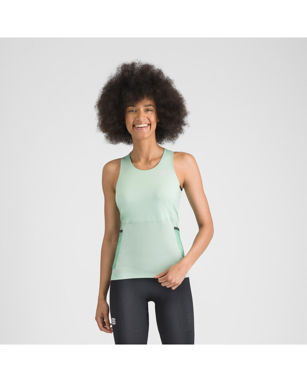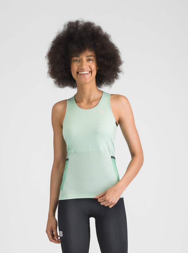 Damski bezrękawnik rowerowy z szerokimi ramiączkami idealnie sprawdzi się nie tylko na długich wycieczkach, ale także podczas codziennej jazdy w lecie. Z przodu znajduje się podwójna warstwa funkcjonalnego materiału, która zapewnia wygodne noszenie bez stanika i swobodę ruchów. Podkoszulek wyposażony jest w aż pięć otwartych kieszeni oraz element odblaskowy zapewniający lepszą widoczność.