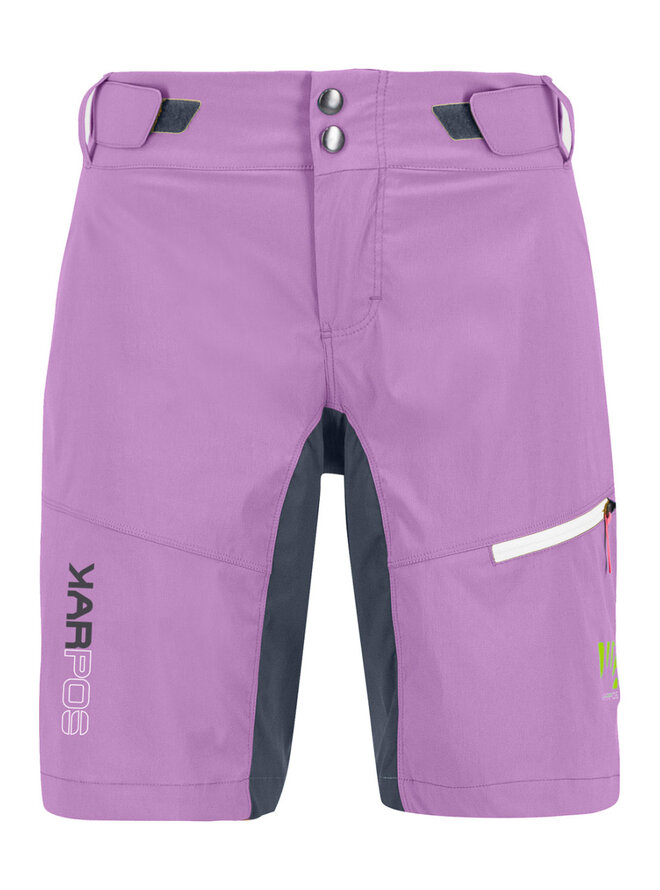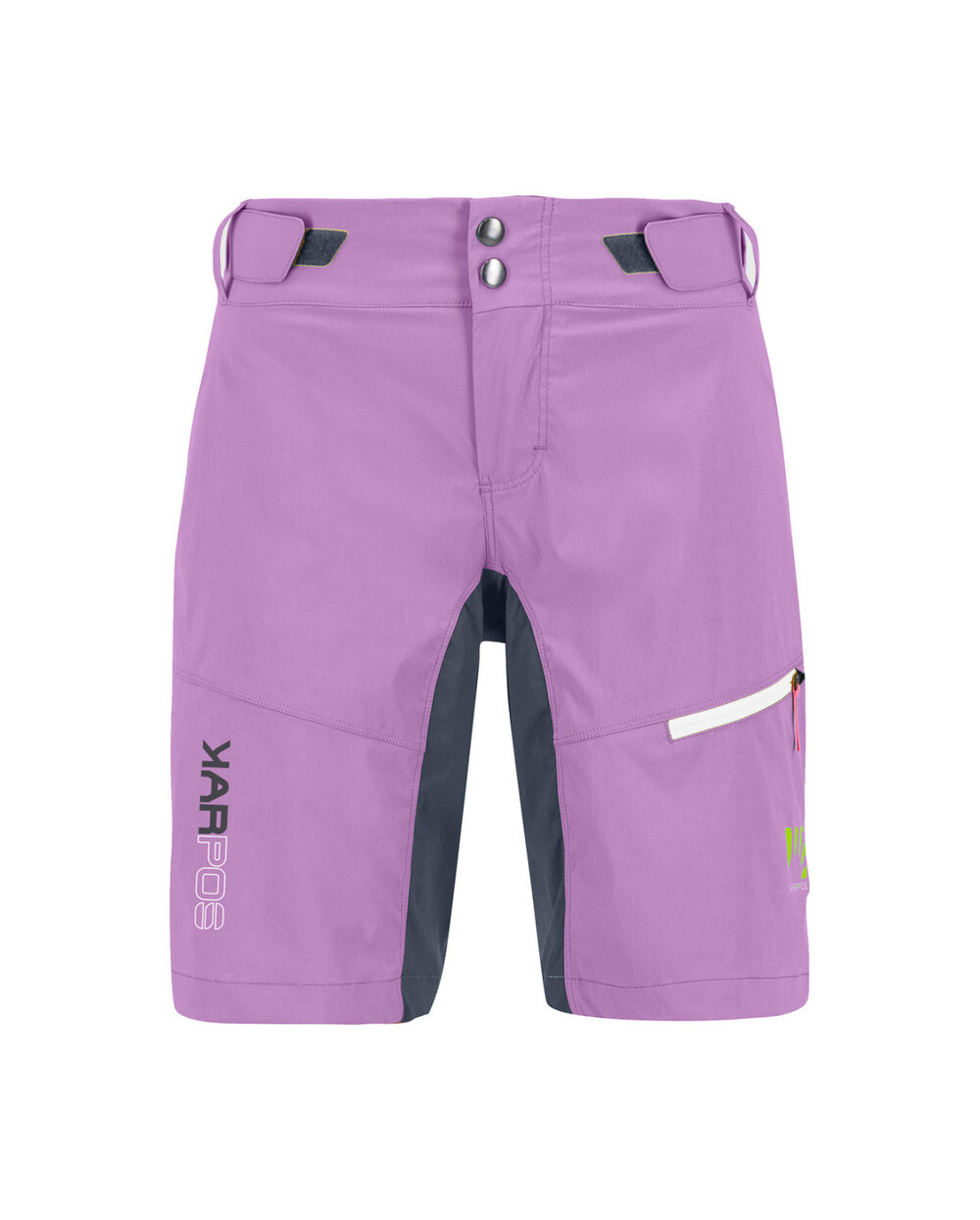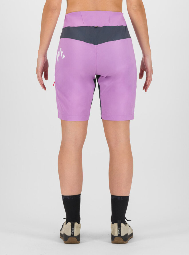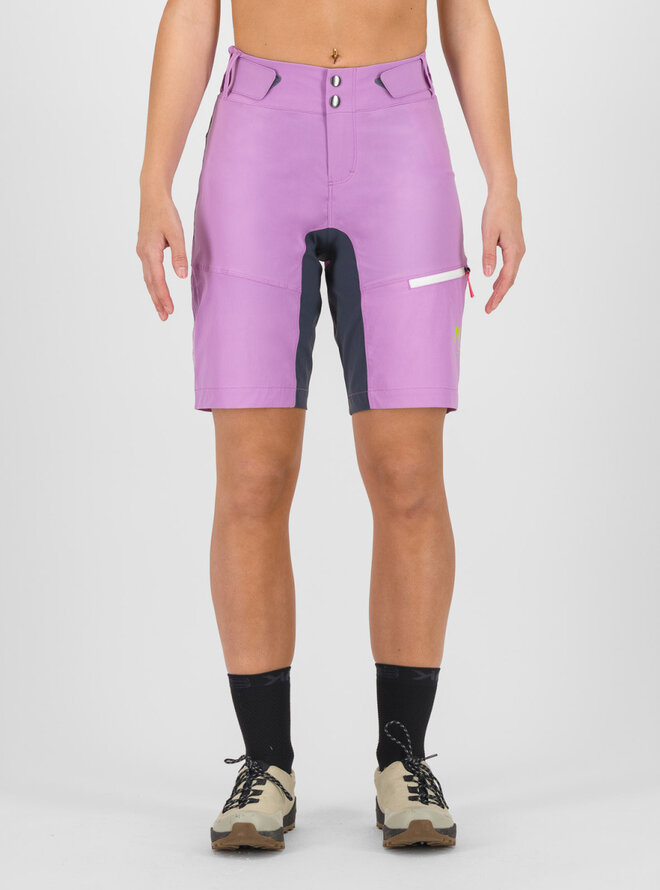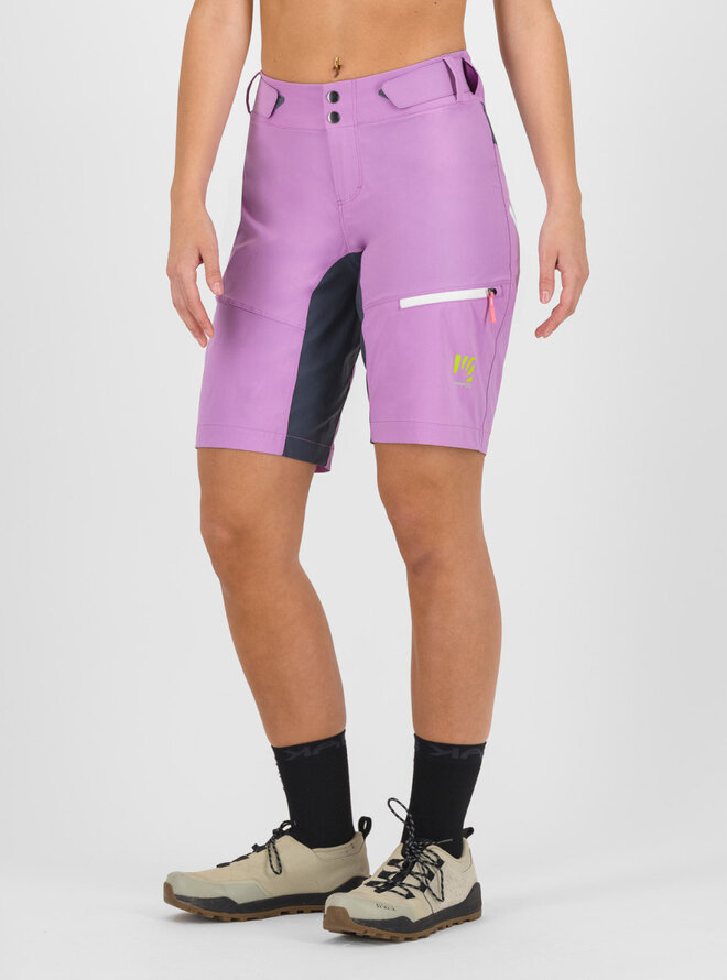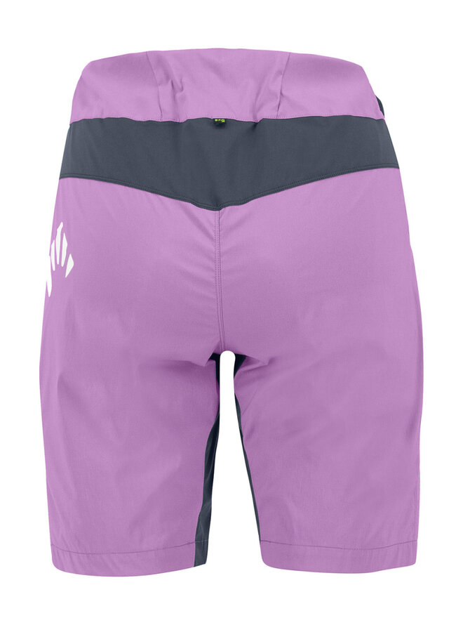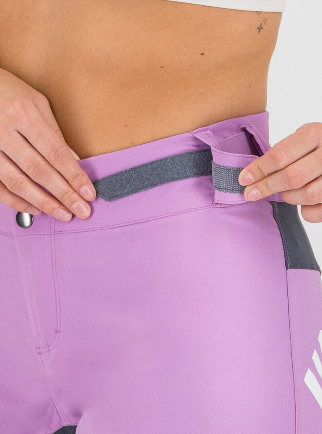 Damskie spodenki MTBVal Viola są wykonane z lekkich, chłodnych i trwałych materiałów z wykończeniem DWR, które odpycha wodę i brud. Nie posiadają wyjmowanych, wewnętrznych spodenek ani wkładki rowerowej. Dla idealnego dopasowania spodenki wyposażono w paski na rzepy. Krótkie spodnie do jazdy na rowerze górskim, outdooru, pieszych wędrówek i do spędzania wolnego czasu.