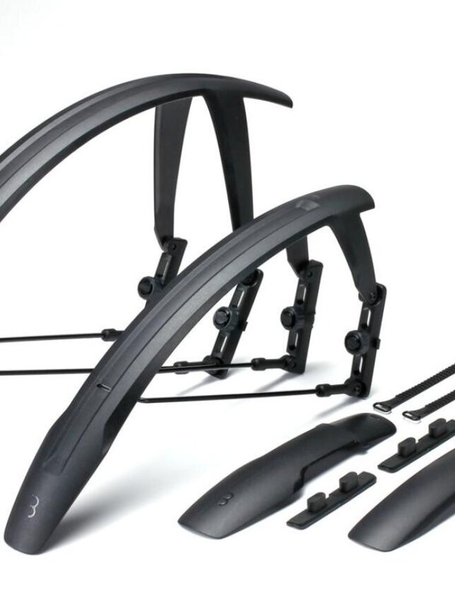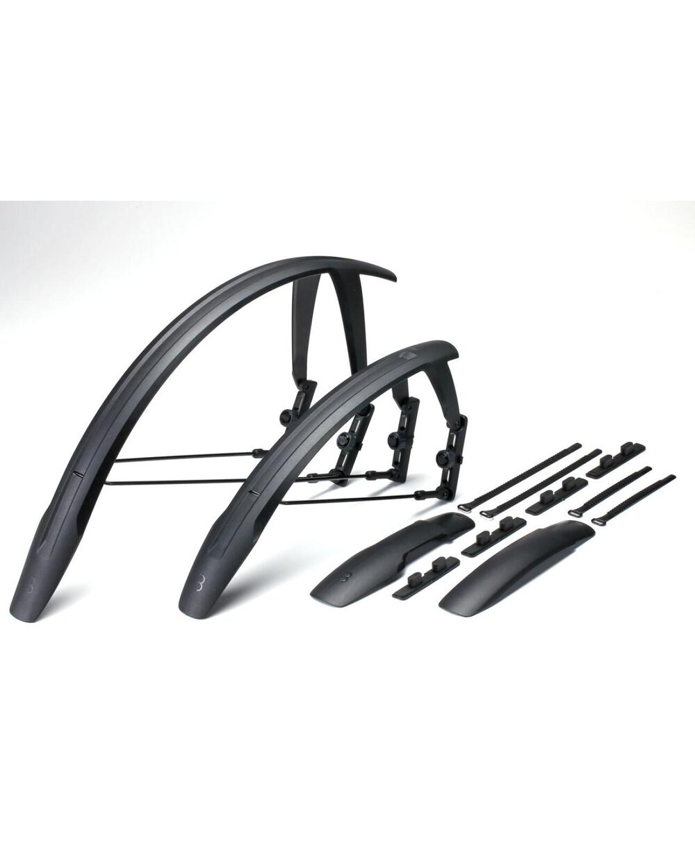 Błotniki z pełną regulacją kąta, wysokości i długości Beznarzędziowy system montażu na wspornikach siodełka i przednim widelcu dla szybkiej instalacji Duża antypoślizgowa gumowa powierzchnia montażowa zapewniająca stabilność i ochronę ramy Dostarczany z zestawem przedłużek dla większej wszechstronności Wykonany w 75% z trwałego i mocnego materiału PP z recyklingu z certyfikatem GRS Kompatybilny z kołami 28" Maksymalna szerokość opony to 1,6"Szczegóły