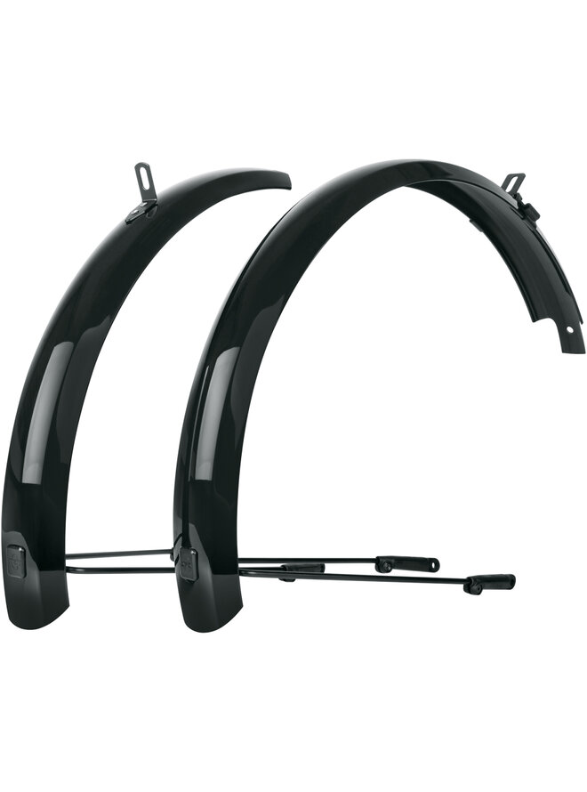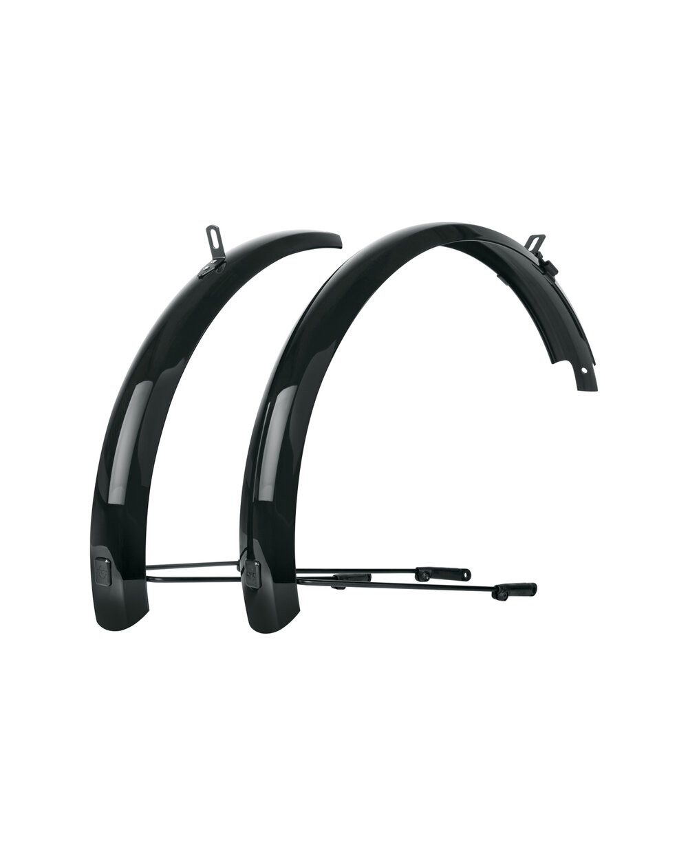 SKS Bluemels Basic to zestaw błotników wykonanych z solidnej konstrukcji typu sandwicz. Błyszcząca konstrukcja robi wrażenie, niezawodnie chroni przed brudem i rozpryskami wody. Dzięki elastycznej konstrukcji warstwowej, w której ultracienkie paski aluminium są osadzone w powłoce z tworzywa sztucznego, błotniki są wyjątkowo wytrzymałe, sztywne i odporne na korozję. Stanowią doskonałą ochronę dzięki montażowi blisko obudowy. Niezależnie od tego, czy poruszasz się po drogach gruntowych, czy leśnych, błotniki BLUEMELS Basic zapewniają doskonałą wszechstronną ochronę. System bezpieczeństwa ESC rozłącza rozpórki w przypadku, gdy gałęzie utkną między szprychami koła, zapobiegając utknięciu koła.