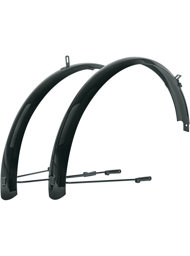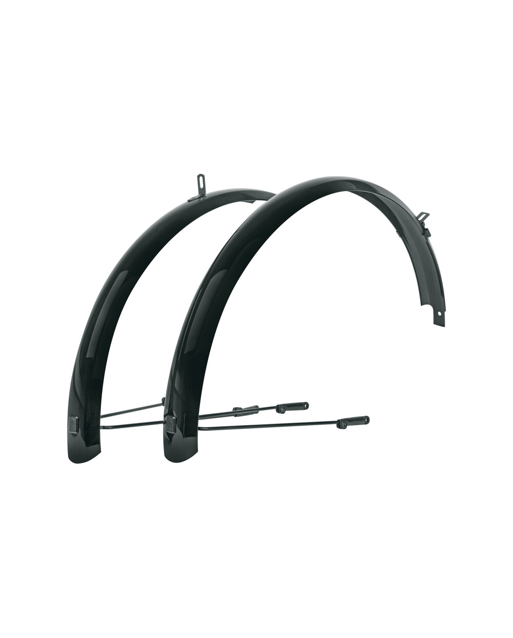 SKS Bluemels Basic to zestaw błotników wykonanych z solidnej konstrukcji typu sandwicz. Ich błyszczący design robi wrażenie, niezawodnie chroni przed brudem i rozpryskami wody. Dzięki elastycznej konstrukcji warstwowej, w której ultracienkie paski aluminium są osadzone w powłoce z tworzywa sztucznego, błotniki są wyjątkowo wytrzymałe, sztywne i odporne na korozję. Stanowią doskonałą ochronę dzięki montażowi blisko obudowy. Niezależnie od tego, czy poruszasz się po drogach gruntowych, czy leśnych, błotniki BLUEMELS Basic zapewniają doskonałą wszechstronną ochronę. System bezpieczeństwa ESC odłącza rozpórki, jeśli gałęzie utkną między szprychami koła, zapobiegając utknięciu koła.
