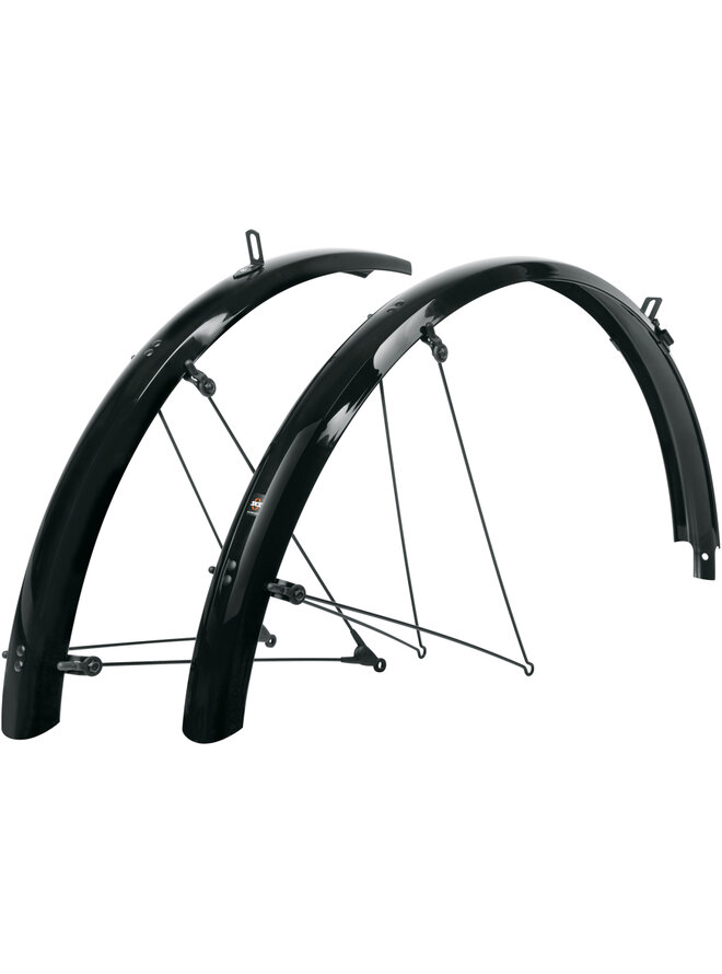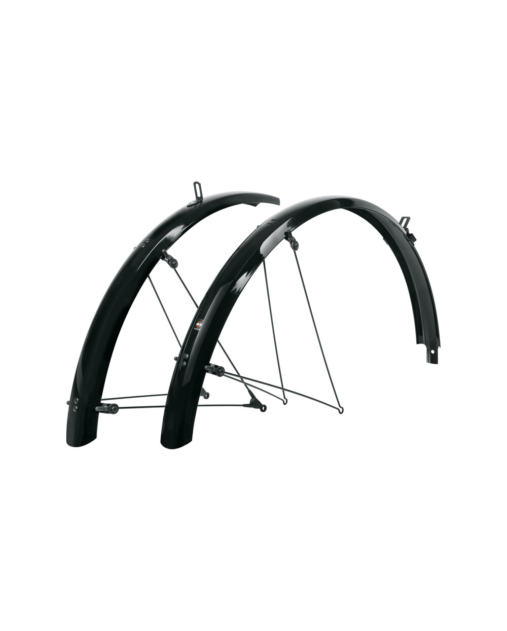 SKS Bluemels Basic to zestaw błotników wykonanych z solidnej konstrukcji typu sandwicz. Błyszcząca konstrukcja robi wrażenie, niezawodnie chroni przed brudem i rozpryskami wody. Dzięki elastycznej konstrukcji warstwowej, w której ultracienkie paski aluminium są osadzone w powłoce z tworzywa sztucznego, błotniki są wyjątkowo wytrzymałe, sztywne i odporne na korozję. Stanowią doskonałą ochronę dzięki montażowi blisko obudowy. Niezależnie od tego, czy poruszasz się po drogach gruntowych, czy leśnych, błotniki BLUEMELS Basic zapewniają doskonałą wszechstronną ochronę. System bezpieczeństwa ESC rozłącza rozpórki w przypadku, gdy gałęzie utkną między szprychami koła, zapobiegając utknięciu koła.