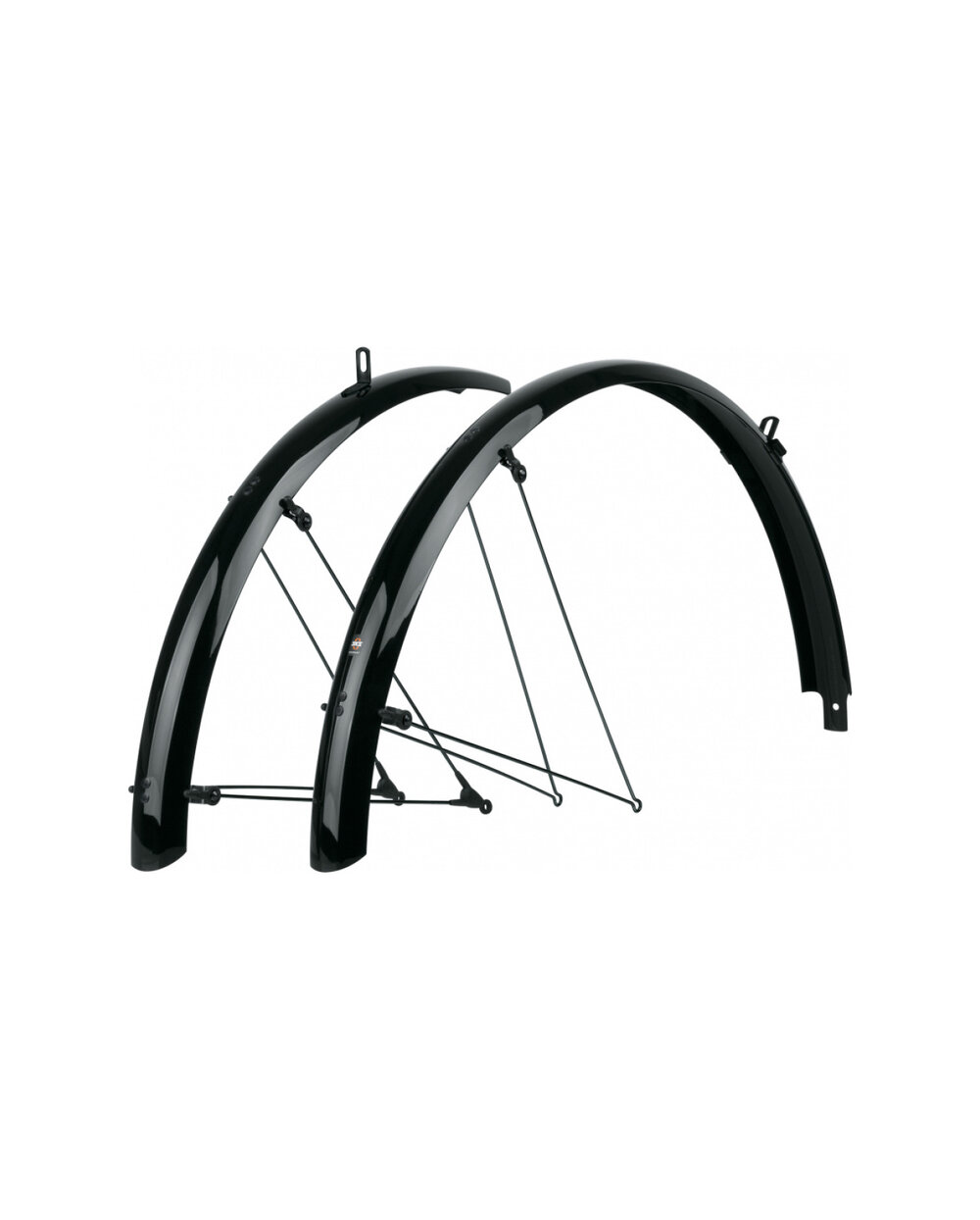 SKS Bluemels Basic to zestaw błotników wykonanych z solidnej konstrukcji typu sandwicz. Ich błyszczący design robi wrażenie, niezawodnie chroni przed brudem i rozpryskami wody. Dzięki elastycznej konstrukcji warstwowej, w której ultracienkie paski aluminium są osadzone w powłoce z tworzywa sztucznego, błotniki są wyjątkowo wytrzymałe, sztywne i odporne na korozję. Stanowią doskonałą ochronę dzięki montażowi blisko obudowy. Niezależnie od tego, czy poruszasz się po drogach gruntowych, czy leśnych, błotniki BLUEMELS Basic zapewniają doskonałą wszechstronną ochronę. System bezpieczeństwa ESC odłącza rozpórki, jeśli gałęzie utkną pomiędzy szprychami koła, zapobiegając utknięciu koła.