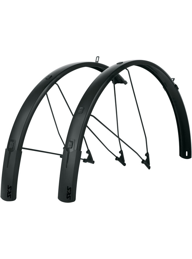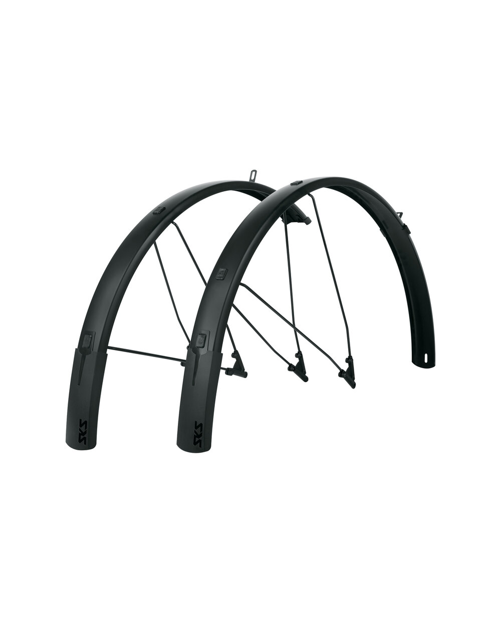 SKS Bluemels Style to zestaw błotników z elastycznym spojlerem, który zapewnia doskonałą wszechstronną ochronę przed zachlapaniem. Dzięki elastycznej konstrukcji typu sandwicz, w której ultracienkie paski aluminium są osadzone w powłoce z tworzywa sztucznego, błotnik jest wyjątkowo wytrzymały, sztywny i odporny na korozję. Model posiada nowy adapter V z systemem bezpieczeństwa ESC, który odłącza podwójne rozpórki w kształcie litery U, jeśli gałęzie utkną między końcami. Powinno to zapobiec utknięciu koła. Dzięki matowemu czarnemu wykończeniu i czarnym elementom mocującym błotniki mają jednolity wygląd i wyróżniają się wyglądem.