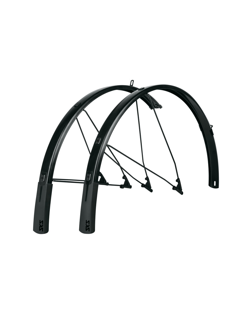 SKS Bluemels Style to zestaw błotników z elastycznym spojlerem, który zapewnia doskonałą wszechstronną ochronę przed zachlapaniem. Dzięki elastycznej konstrukcji typu sandwicz, w której ultracienkie paski aluminium są osadzone w powłoce z tworzywa sztucznego, błotnik jest wyjątkowo wytrzymały, sztywny i odporny na korozję. Model posiada nowy adapter V z systemem bezpieczeństwa ESC, który odłącza podwójne rozpórki w kształcie litery U, jeśli gałęzie utkną między końcami. Powinno to zapobiec utknięciu koła. Dzięki matowemu czarnemu wykończeniu i czarnym elementom mocującym błotniki mają jednolity wygląd i wyróżniają się również pod względem wyglądu.