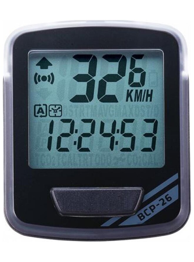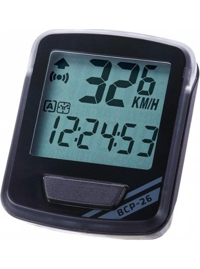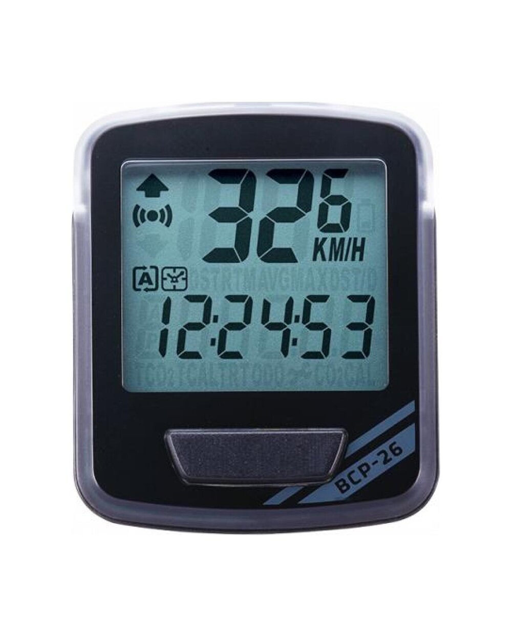 Przewodowy licznik rowerowy z 12 funkcjami:Prędkość bieżącaPrędkość maksymalnaDługość jazdyCałkowita długość jazdyCzas jazdyCałkowity czas jazdyPorównanie prędkościZegarAutomatyczne skanowanieAuto start/stopWskaźnik niskiego poziomu naładowania bateriiUniwersalne mocowanie na kierownicę lub wspornik kierownicy.Łatwa obsługa jednym przyciskiem.Wodoodporna obudowa.Bateria w zestawie.Instrukcja obsługi i instalacji.