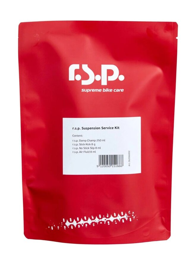 Zestaw serwisowy RSP do zawieszenia (widelce i amortyzatory), który zawiera 250 ml w pełni syntetycznego oleju "Damp Champ"o lepkości 5 mas, smar"Slick Kick"(8 g), dodatek"No Stick Slip"(8 ml) i smar"Air Fluid" (8 ml). Zestaw został zaprojektowany w celu zmniejszenia tarcia i procesów pienienia w zawieszeniu i zapewnia płynne, niezawodne działanie zawieszenia nawet pod ciśnieniem.Szczegóły