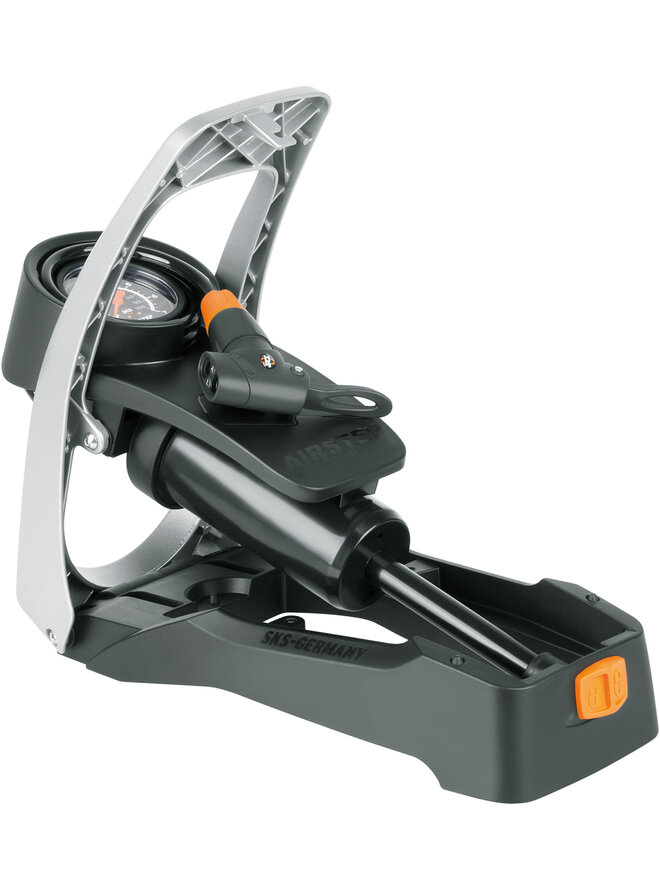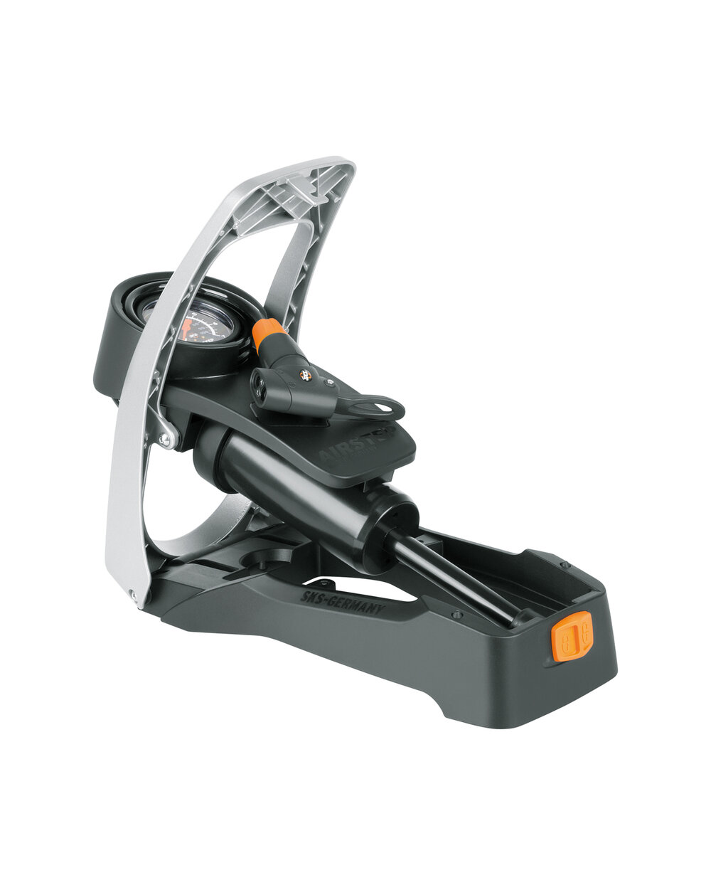 Pompka nożna SKS Germany AirStep łączy w sobie cechy klasycznej pompki i najnowsze technologie Made in Germany. Najwyższej jakości materiały, koncepcja konstrukcji i przyjazne dla użytkownika funkcje (duży manometr, zintegrowany wąż spiralny z głowicą zaworu do wszystkich typów zaworów) nadają pompie zupełnie nowy i innowacyjny wygląd. Ergonomiczny, solidny aluminiowy pedał umożliwia bez trudu osiągnięcie maksymalnego możliwego ciśnienia 7 barów/102 PSI. Pompowanie nigdy nie było tak łatwe i delikatne dla pleców. Po napompowaniu pedał należy wcisnąć i zabezpieczyć przyciskiem, co pozwala zaoszczędzić miejsce. Istnieje również możliwość zawieszenia dzięki dołączonemu uchwytowi ściennemu.
