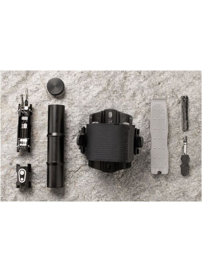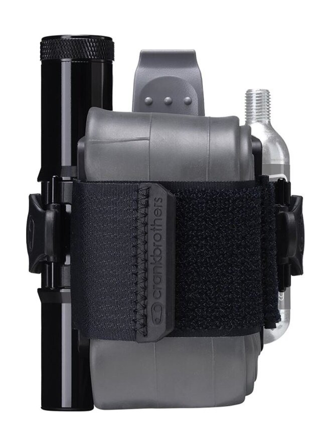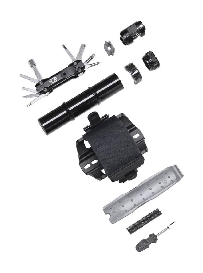 Uchwyt na zapasową dętkę lub inny sprzęt zapinany na rzep. Montaż zamiast kosza. W bocznej przestrzeni do przechowywania znalazło się duże wielofunkcyjne narzędzie, a po drugiej stronie kosza można zamontować butlę CO2 lub mini pompkę. NARZĘDZIA Stal o wysokiej wytrzymałości • klucze centrujące #0, #1 i #2 • Klucze imbusowe 2 / 2,5 / 3 / 4 / 5 / 6 / 8 mm • śrubokręt płaski • Klucz Torx T10 i T25 • wiklina • dźwignia montażowa • klucz do zaworu • Adapter butli CO2 Waga 229g Miejsce na szybkozłączkę i butlę lub pompę CO2 16/20g Jej szerokość nie przeszkadza w pedałowaniuSzczegóły