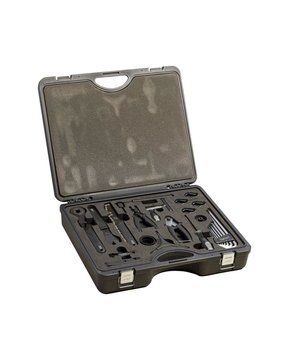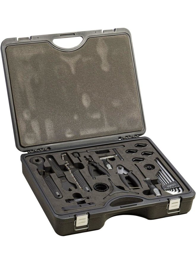 Idealny zestaw dla hobbystów zajmujących się naprawami. Trwała plastikowa walizka z piankowym wypełnieniem. Zawiera 27 narzędzi: Zestaw ściągaczy do kaset, klucz do pedałów 15mm, nitownica do łańcucha, przecinaki do kabli, 3szt. monter, narzędzia do szybkozłączek, klucze Y - hex star 4/5/6mm i 2/2,5/3, torx T20/25/30, 6szt. klucze sześciokątne 8szt 2/2,5/3/4/4/5/6/8/10, klucz do konwerterów, klucze centrujące 4szt 3,6/3,75/4/4,4, śrubokręt krzyżakowy PH2, wybijak centrujący do Hollowtech II, zestaw klejów, otwieracz do butelek.Szczegóły