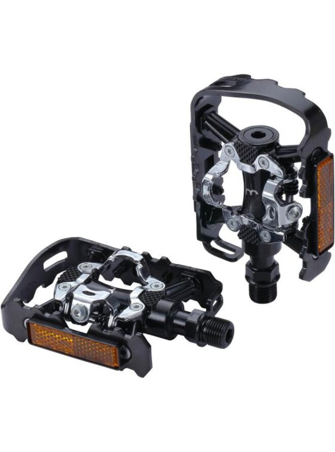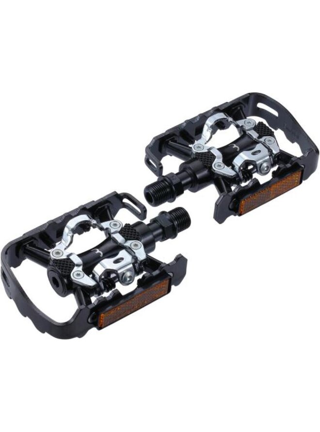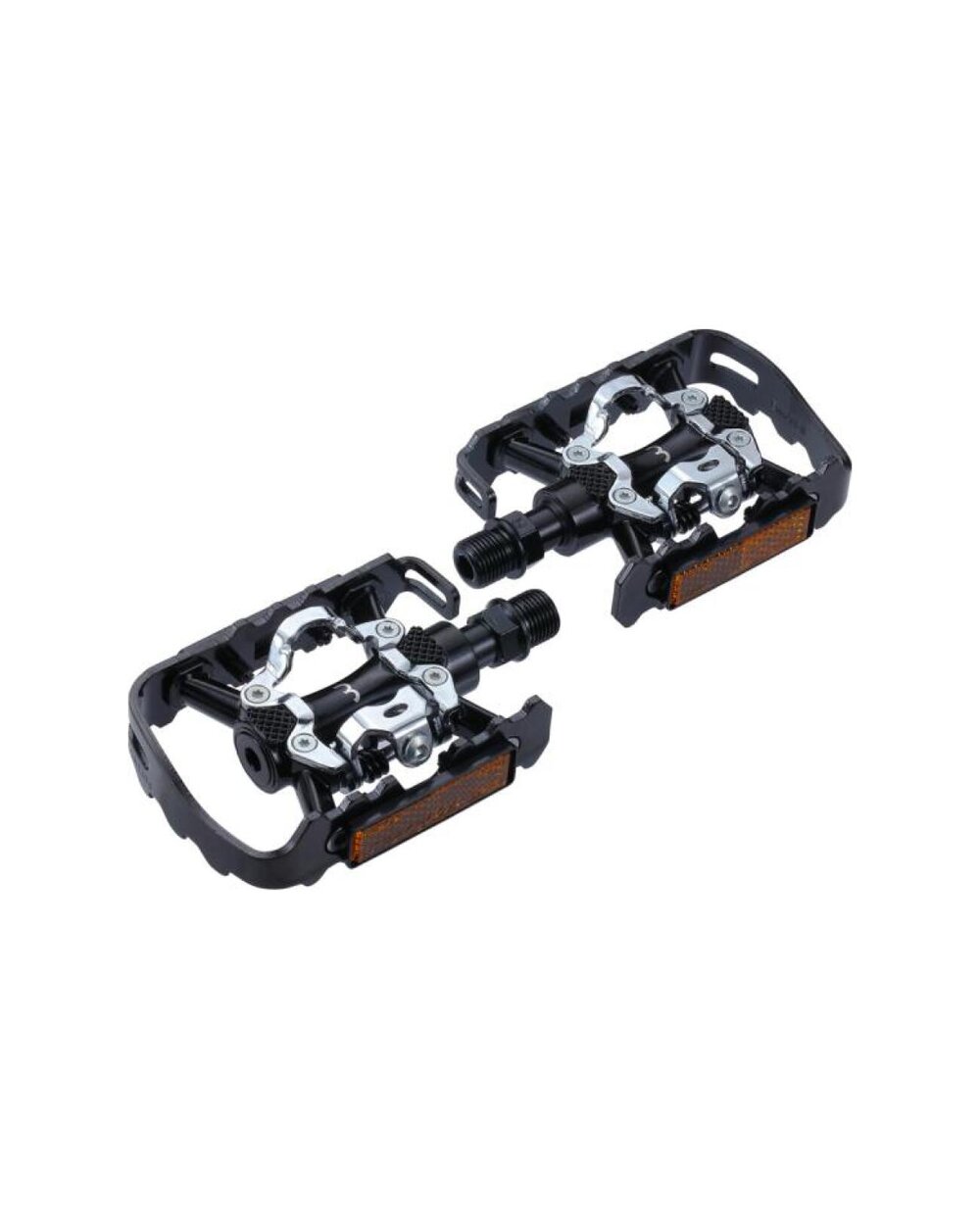 Dwufunkcyjne pedały. Jedna strona kompatybilna z SPD, a druga z antypoślizgowymi płytkami do klasycznych butów.Regulowana siła zacisku.Łatwy w obsłudze mechanizm zaciskowy.Bardzo trwała blokada CrMo. Zamknięte łożyska przemysłowe.Montaż za pomocą klucza widełkowego 15 mm lub klucza imbusowego 6 mmDostarczane z zatrzaskami BBB Click&.Szczegóły