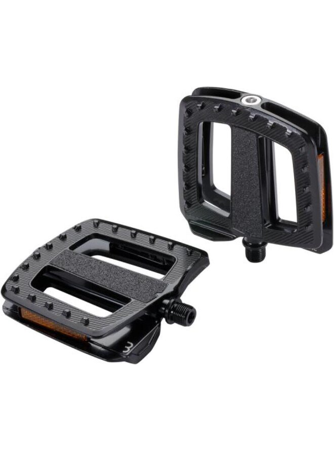 Ergonomiczne pedały odpowiednie do rowerów miejskich i elektrycznych Duża aluminiowa platforma zapewnia stabilność i wygodę podczas pedałowania Doskonała przyczepność w każdych warunkach pogodowych dzięki wyprofilowanym pinom i antypoślizgowej powierzchni Lepsza widoczność dzięki dwóm odblaskowym szkiełkom dla większego bezpieczeństwa. Ten pedał posiada certyfikat EN15194 i Zeddler Advanced XXL. Czop pedału z wytrzymałej stali CrMo zamontowany na łożyskach przemysłowychSzczegóły