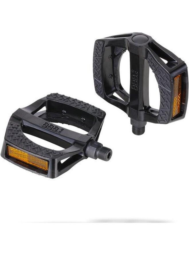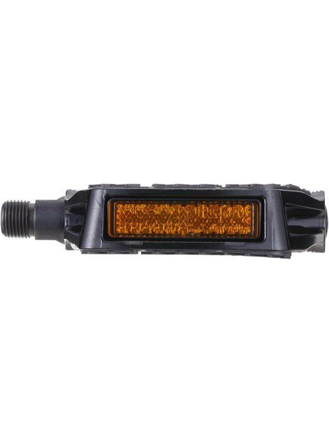 Ergonomicznie ukształtowany pedał z dużą powierzchnią podparcia. Wytrzymały stalowy korpus z antypoślizgową gumową powierzchnią. Wbudowane odblaski zwiększające bezpieczeństwo. Bezobsługowe łożyska DU. Nadaje się do użytku w rowerach elektrycznych. Waga (g): 484. Kolor: czarny. Szczegóły