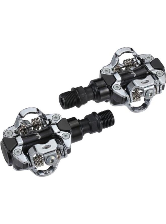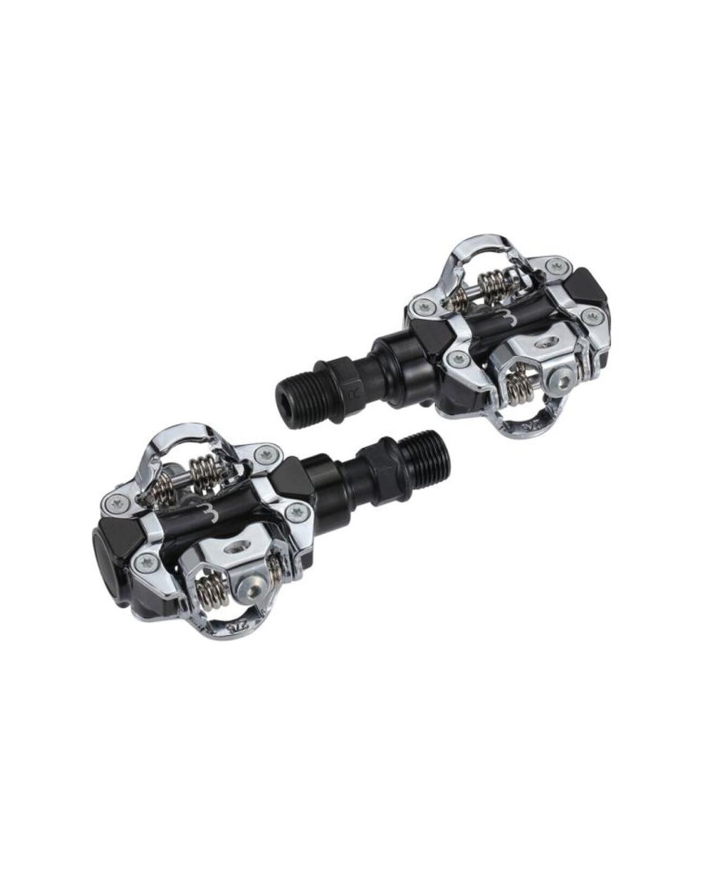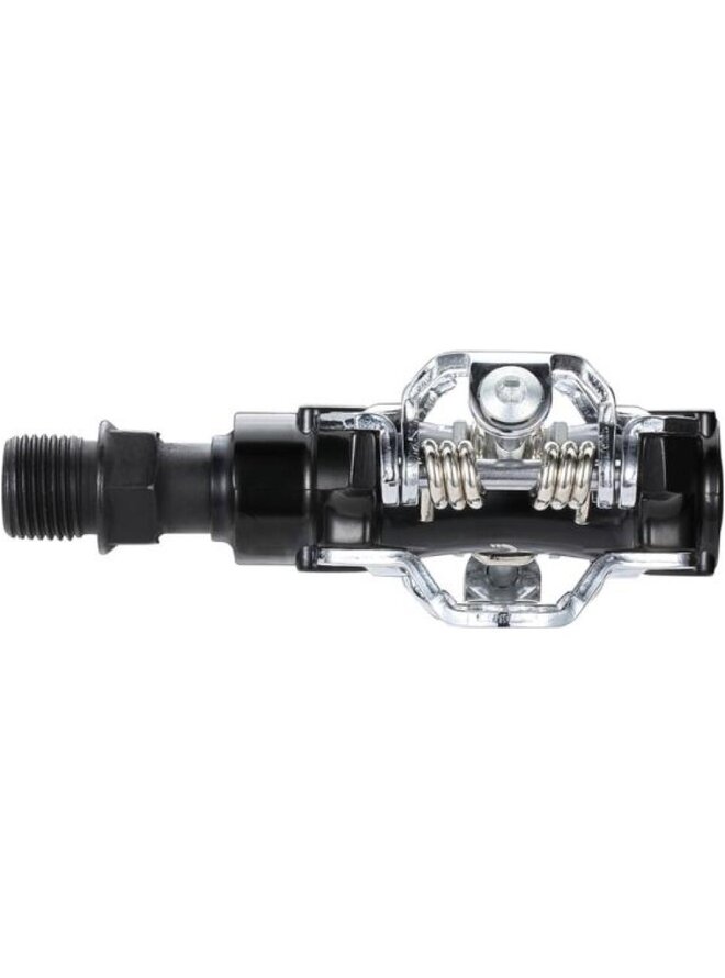 Pedały kompatybilne z systemem SPD Regulowana siła zacisku Solidny aluminiowy korpus Trwałe łożyska kulkowe Zatyczki SPD w zestawie Materiał podkładki: CrMo Materiał korpusu pedału: Aluminium System mocowania: SPD Kolor: Czarny Waga: 407 g. Szczegóły