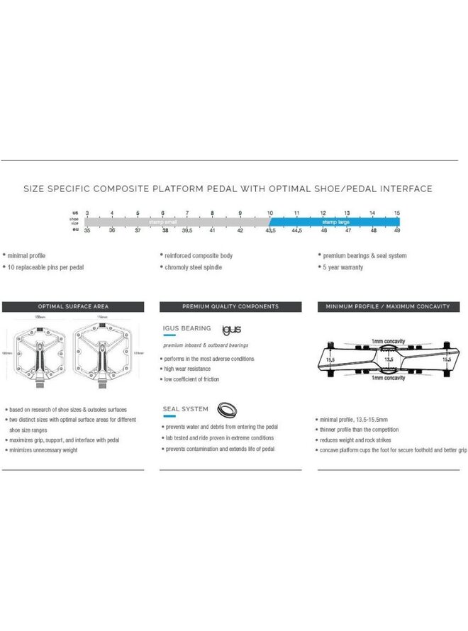 Nadeszła kolejna generacja najpopularniejszego pedału platformowego w Kalifornii! Nowe pedały Stamp 1 opierają się na dziedzictwie całej rodziny pedałów Stamp i mają wklęsłą platformę zapewniającą większą pewność na szlaku, sprawdzone komponenty wewnętrzne z pedału Stamp 7 zapewniające dużą trwałość i trwałość oraz nową jednoczęściową konstrukcję sworznia zapewniającą maksymalną przyczepność i łatwą wymianę pinów! Nowa wersja pedałów Stamp 1 została stworzona z bezkompromisowym zaangażowaniem w jakość i może pochwalić się solidną nylonową obudową oraz sprawdzonymi elementami wewnętrznymi z wielokrotnie nagradzanych pedałów Stamp 7. Zastosowanie: szlak/enduro/freeride/DH/rowery elektryczne/sport/dojazdy do pracy Smukły, wklęsły profil - wysokość korpusu pedału od 13,5 mm do 15,5 mm Waga 348g Korpus platformy: 114 x 111 mm (buty 43,5 do 49), wysokość 13,5-15,5 mm Platforma: kompozyt nylonowy Oś: kuta stal Cr-Mo Łożysko wewnętrzne: tuleja ślizgowa Igus LL Łożysko zewnętrzne: tuleja ślizgowa Igus LL Nowe jednoczęściowe wymienne sworznie, 10 sztuk na pedał (wysokość sworznia wewnętrznego 23 mm, wysokość sworznia zewnętrznego 25 mm) Stempel Small zalecany dla rozmiarów butów: 3-10 (US M) // 37-43,5 (UE) Stempel Large zalecany dla rozmiarów butów: 10-15 (US M) // 43,5-49 (UE)Szczegóły