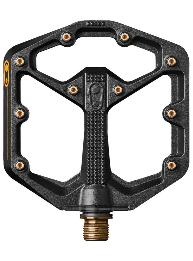 Górny pedał platformowy w dwóch rozmiarach dla różnych rozmiarów butów. Tytanowa oś zapewnia najniższą możliwą wagę. Minimalny profil 11-13 mm. WAGA 299 g PLATFORMA aluminium 6061-T6 (100 x 100 mm, do butów w rozmiarach 37-43) oś 6Al/4V tytan OSŁONA WEWNĘTRZNA Tuleje ślizgowe Igus LL OBUDOWA WEWNĘTRZNA Tuleje ślizgowe Igus LL PINY 10 z każdej strony, wymienne Maksymalna waga rowerzysty: 90 kg TESTY MEDIALNE: http://www.bikeandride.cz/2016/11/pedaly-crankbrothers-stamp-large-prakticke-predstaveni/Szczegóły
