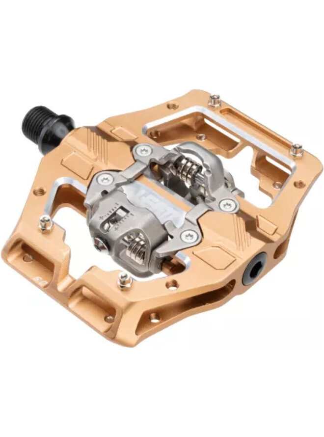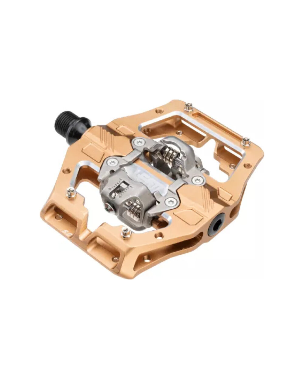 Ciało pedału grawitacyjnego bez klipsów jest wykonane z aluminium 6061-T6 uprawianego przez CNC. Wykorzystuje ultra-nieuzasadnione kute i CNC uprawiane chrom-molibden osi stalowy. W pełni sprawdzony system potrójnych łożysk składa się z samozadowolenia LSL, łożyska igieł i łożyska przemysłowego. Czterokrotnie pieczęci utrzymują suche części wewnętrzne w dowolnym warunkach. System klipsów z podwójnie podłączony jest kompatybilny z klasycznymi buty piłkarskimi SPD. System retencji ma regulowane napięcie sprężyny do drobnego połączenia i uwalniania oraz oferuje 5 stopni swobodnego ruchu. Duża platforma wokół systemu klipów zapewnia solidną obsługę zoptymalizowanego sterowania i przenoszenia mocy. Pedał jest testowany i certyfikowany zgodnie z EFBE EPAC EPAC Gravity Tri-Test® (kategoria 5).