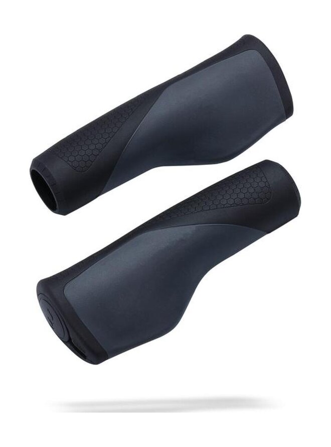 Ergonomicznie ukształtowane kratonowe/korkowe uchwyty z żelową podpórką pod dłoń. Specjalny wewnętrzny mechanizm blokujący pozwala zabezpieczyć zarówno uchwyt, jak i końcówkę przed przekręceniem. Bardzo wygodne dzięki specjalnemu anatomicznemu kształtowi i podpórkom pod dłonie. Chowana aluminiowa tuleja zapobiega przesuwaniu się chwytów na kierownicy. Łatwy montaż. Długość (mm):130/130. Wykonane z:Korok, gumy Kraton, żelu. Kolor: czarny/ciemnoszary, korek/czarny.Szczegóły