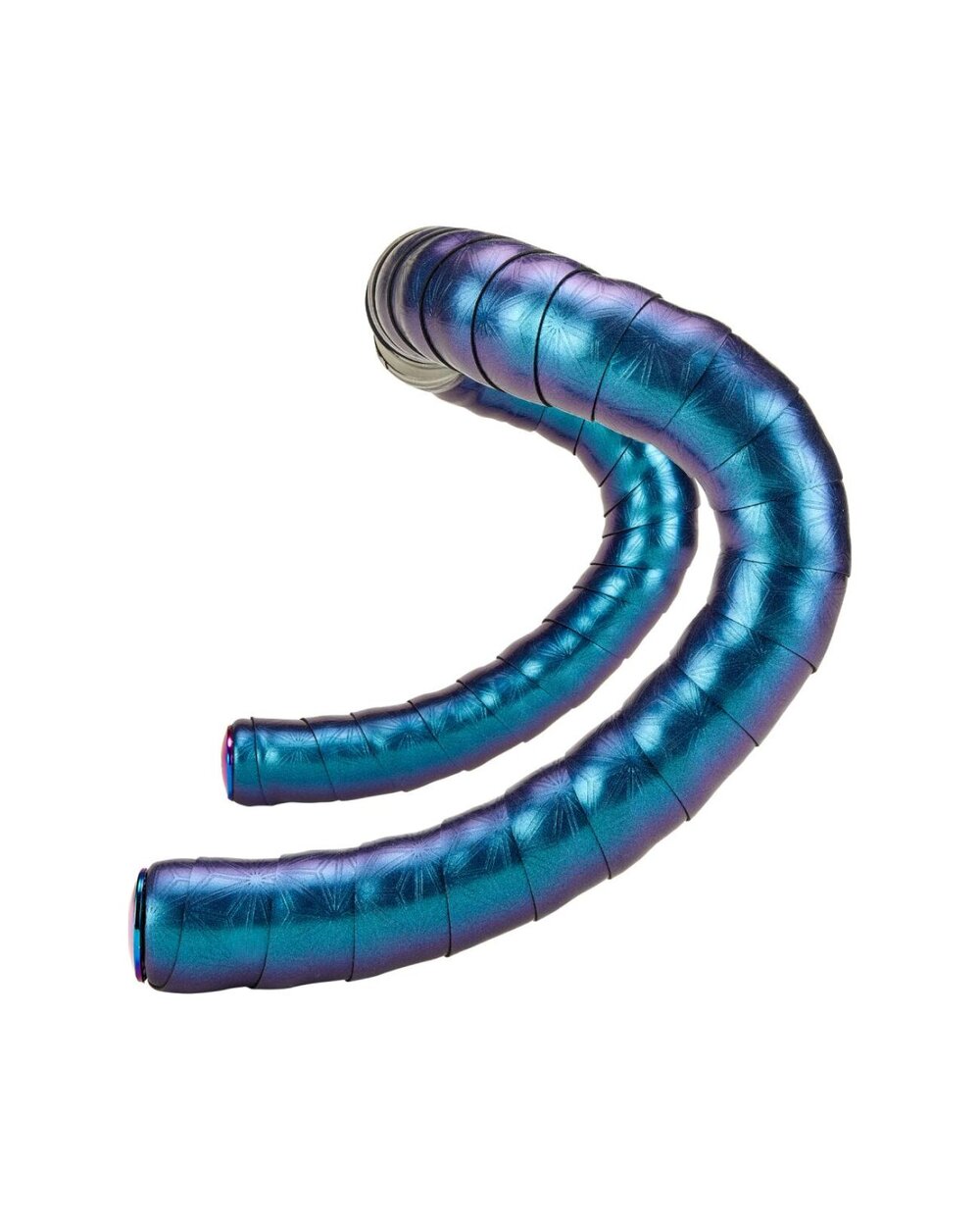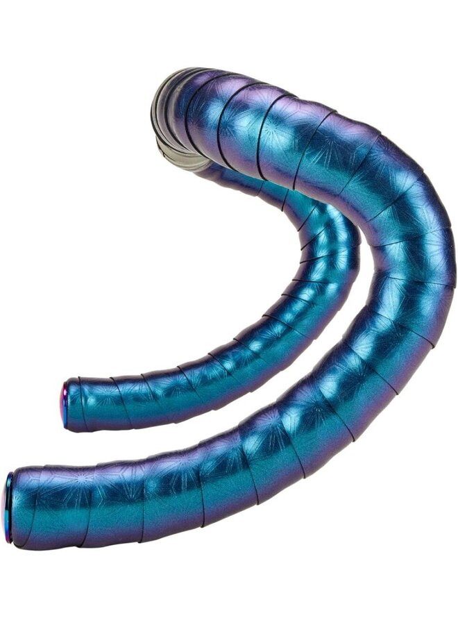 Taśma na kierownicę Supacaz Bling - Oil Slick to najwyższej jakości owijka na kierownicę z charakterystycznym opalizującym efektem „olejowej plamy”, który zmienia kolory w zależności od światła i nadaje motocyklowi bardzo efektowny wygląd. Wykonany jest z połączenia wierzchniej warstwy PU oraz warstwy pianki/żelu Kush Foam, która znacząco tłumi drgania i zwiększa komfort jazdy. Materiały są odporne na promieniowanie UV, pot i warunki atmosferyczne, dzięki czemu chusta zachowuje swój wygląd nawet przy intensywnym użytkowaniu. Chusta ma długość około 2160 mm, szerokość 30 mm i grubość około 3 mm, co zapewnia przyjemny chwyt nawet podczas długich podróży. Opakowanie zawiera dwie rolki folii, aluminiowe zaślepki Star Plugz i taśmę wykończeniową zapewniającą czyste i szczelne wykończenie. Zaprojektowany, aby połączyć odważny styl z funkcjonalnością, dobrą amortyzacją i trwałością, model ten jest popularny wśród rowerzystów, którzy chcą połączyć wygodę i efekt wizualny.Szczegóły