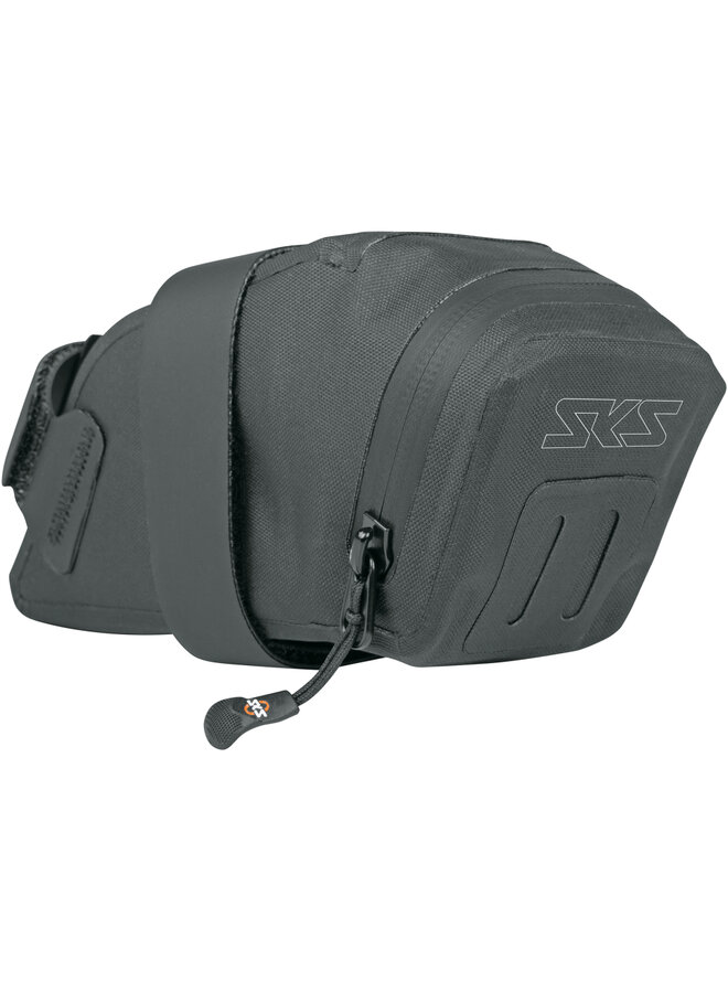 Dwie wewnętrzne kieszenie z siatki pomieszczą bezpiecznie klucze lub pieniądze. Torbę SKS można łatwo przymocować pod siedzeniem roweru za pomocą antypoślizgowych rzepów. Zamki te można indywidualnie skracać i wymieniać. Z tyłu torby znajduje się uchwyt na lampę tylną oraz odblaskowe logo SKS, które zwiększa widoczność w ciemności.