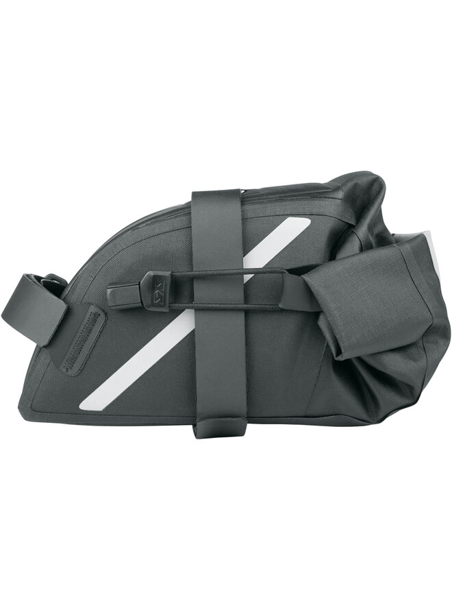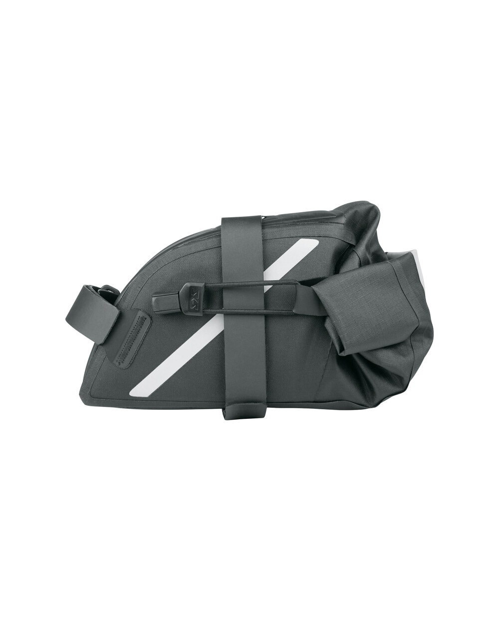 Torba podsiodłowa SKS jest wyposażona w skracalny rzep, który zapewnia bezpieczne mocowanie pod siedzeniem roweru. Dwie wewnętrzne kieszenie wykonane z wytrzymałej siatki pomieszczą klucze lub pieniądze. Odblaskowe paski wzdłuż torby i odblaskowy uchwyt na tylną lampę zwiększają bezpieczeństwo, szczególnie podczas jazdy w ciemności.