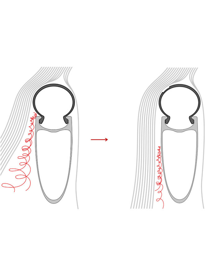 W przypadku stosowania z uszczelnieniem 30 ml Conti Revosealant jest zalecane dla każdego płaszcza. 48 Małe wnęki jest regularnie rozmieszczone na jego powierzchni. Te tak zwane. „Generatory wirów” Kontroluj turbulencje przepływu powietrza na powierzchni przedniego koła. Rezultatem jest zoptymalizowany przepływ powietrza, który zmniejsza odporność całego systemu Wheel - Opona . Zmniejsza to oporność aerodynamiczną systemu koła - pochwa przy wszystkich prędkościach.