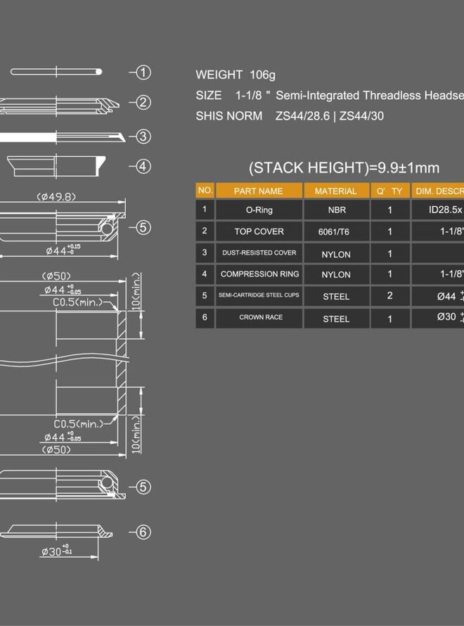Aluminiowa, częściowo zintegrowana głowica ze stalowymi komponentami przeznaczona do widelców z niegwintowanymi szyjkami 1-1/8" (28,6 mm). Łożyska kulkowe zapewniają dość płynną pracę i są łatwe w serwisowaniu. Górna pokrywa ze śrubą i jeżem w zestawie. Materiał: Górne miski: aluminium 6061/T6 obrabiane CNC, Dolne miski i korona: stal Wysokość: 9,9 ± 1 mm Rozmiar: 1-1/8", częściowo zamknięte miski d=44mm Wymiary: 1-1/8" x 44/50 x 30 Łożyska: 5/32" x 22 Waga: 106gSzczegóły