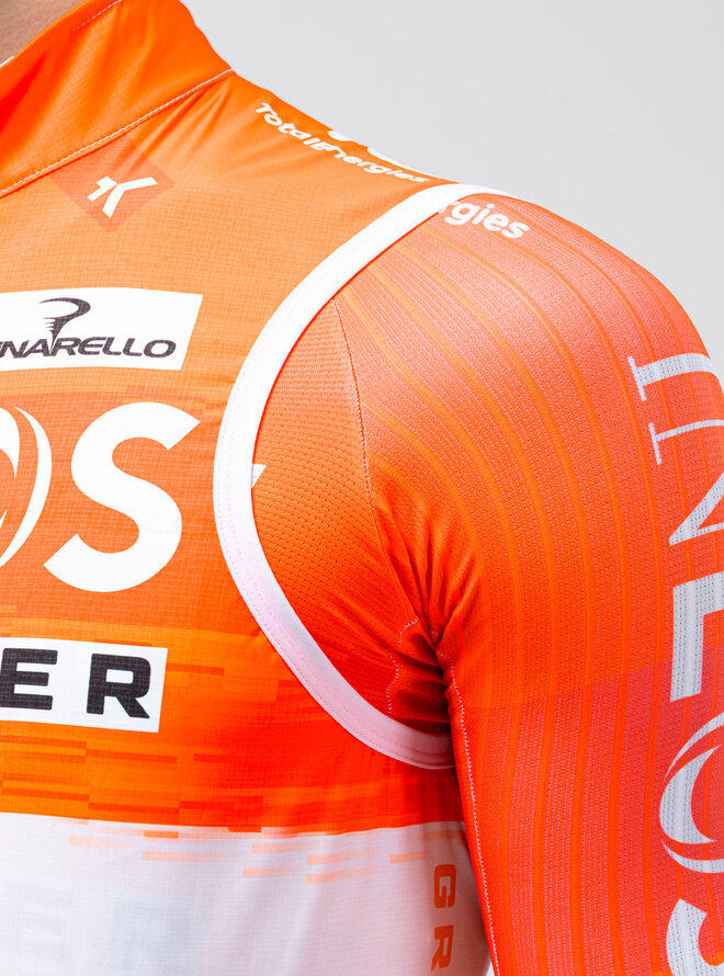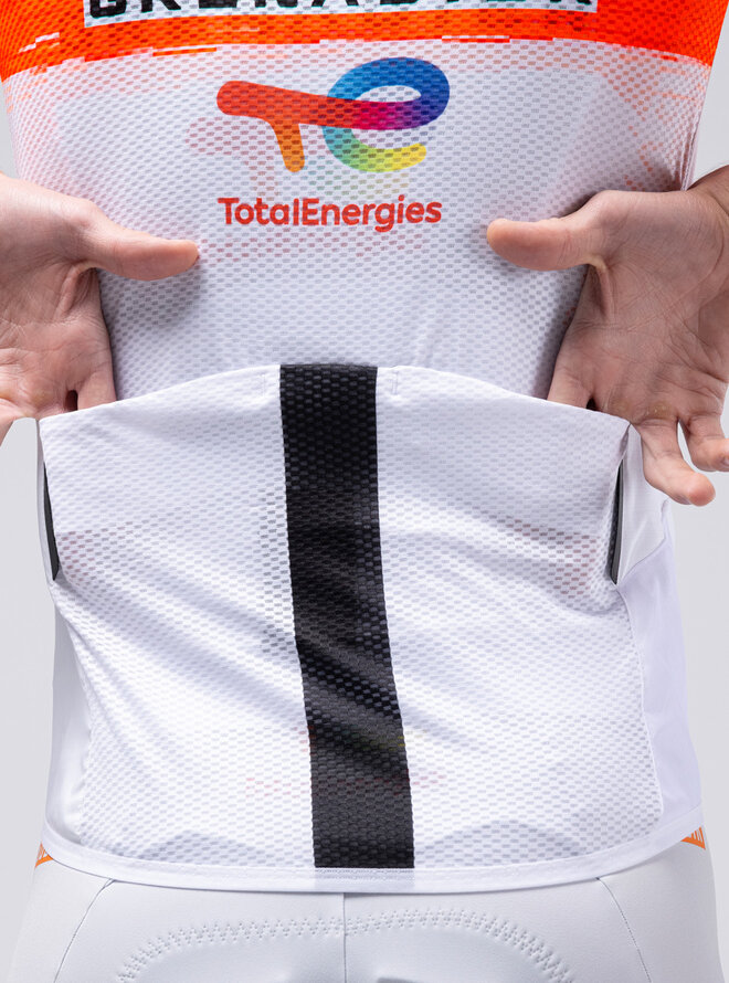 Lekki, aerodynamiczny i wiatroszczelny, zaprojektowany tak, aby zmaksymalizować funkcjonalność na drodze. Jego konstrukcja pozwala na całkowite złożenie go do własnej bocznej kieszeni z siatki, zajmując minimalną przestrzeń i ułatwiając noszenie podczas każdej jazdy. Nowy zoptymalizowany wzór poprawia dopasowanie, zapewniając doskonałą integrację z koszulką, nie powodując dyskomfortu ani ograniczeń. Posiada przeprojektowane tylne otwory, umożliwiające szybki i łatwy dostęp do kieszeni koszulki, nawet podczas ruchu. Zapewnia skuteczną ochronę przed wiatrem klatki piersiowej i okolicy tułowia, szczególnie przydatna we wczesnych godzinach dnia lub podczas długich zjazdów. Wszechstronny sprzymierzeniec w poszerzaniu zakresu termicznego koszulek z długim rękawem i utrzymywaniu temperatury ciała w zmieniających się warunkach. Zoptymalizowane dopasowanie aerodynamiczne. Panel przedni wykonany z teksturowanej tkaniny wiatroszczelnej. Podwyższony kołnierz z elastyczną częścią tylną. Oddychający panel tylny z siateczki. Optymalne dopasowanie w ramionach. Zamek błyskawiczny YKK z podwójnym suwakiem. Boczna kieszeń z siatki. 2 otwory dostępowe do kieszeni koszulki. Odblaskowe detale.Szczegóły