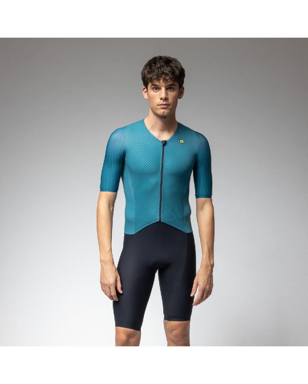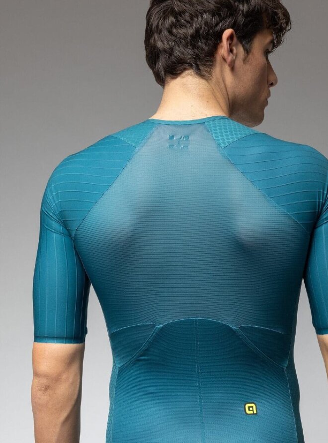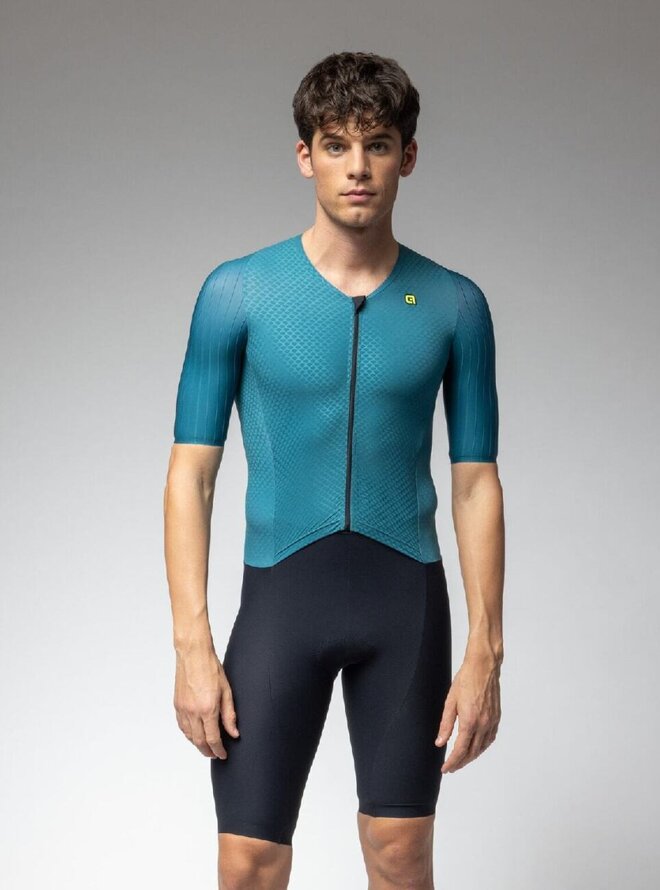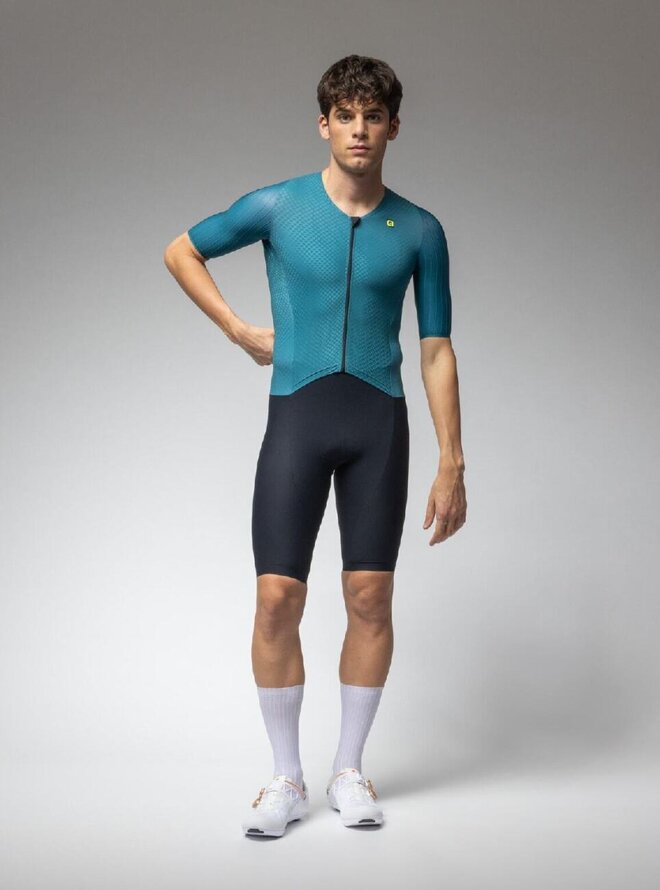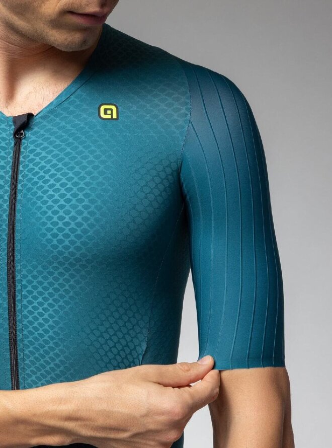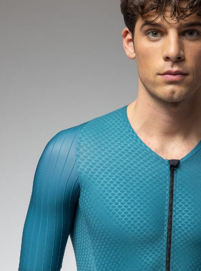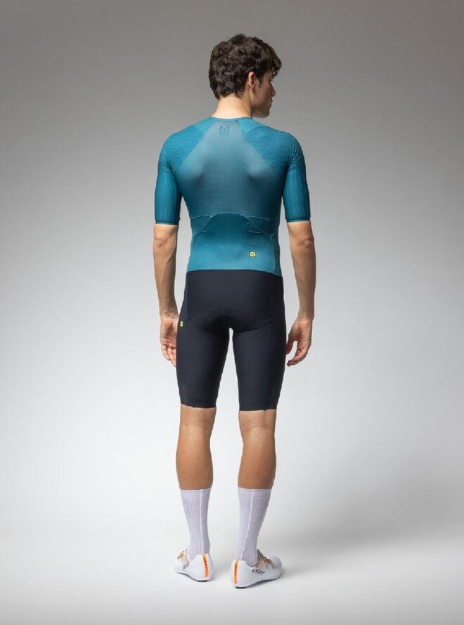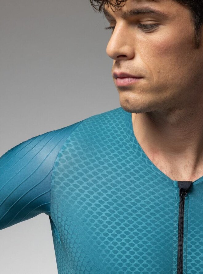 Rękawy z surowo wyciętymi zakończeniami z materiału o strukturze 3D z kanałami zapewniają płynność ruchu i optymalny przepływ powietrza. Część spodni z minimalną liczbą szwów zapewnia skuteczną kompresję, stabilność i niezawodne wsparcie mięśni podczas całego wyścigu.