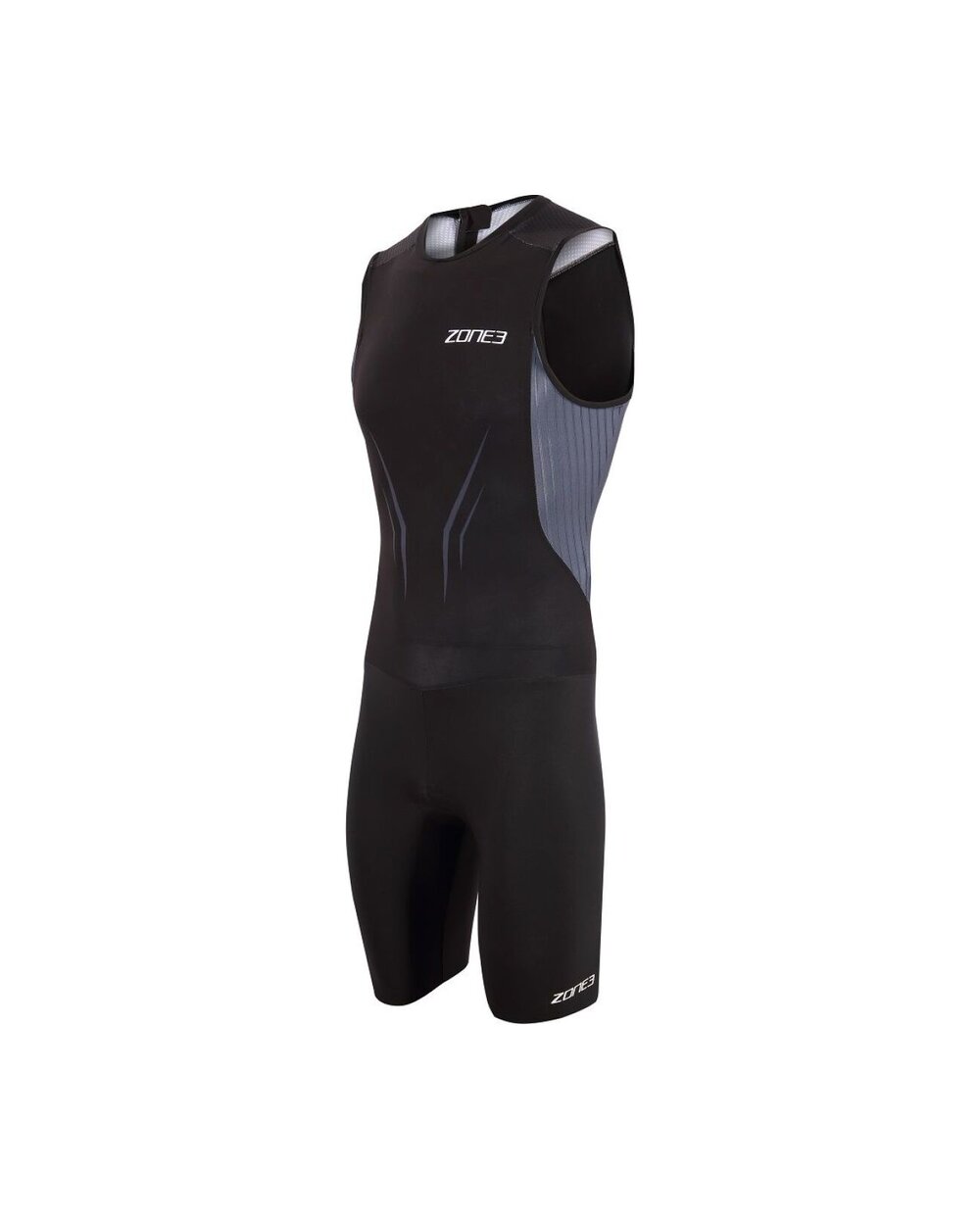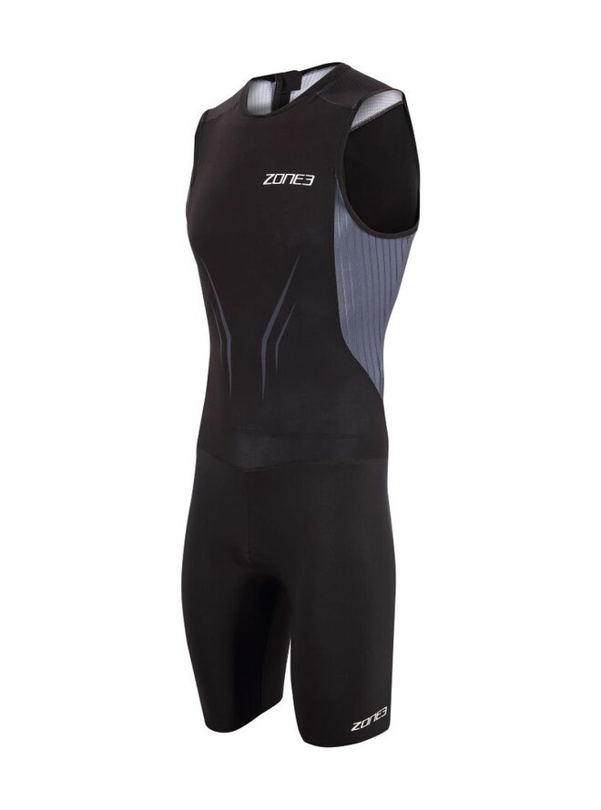 Męski kombinezon bez rękawów Aeroforce-X firmy Zone3 to wysokiej jakości triathlonowy kombinezon bez rękawów przeznaczony dla sportowców, którzy oczekują maksymalnych wyników w każdej dyscyplinie - pływaniu, jeździe na rowerze i bieganiu. Stworzony we współpracy ze specjalistami od aerodynamiki, ten aerodynamiczny projekt został przetestowany w tunelach aerodynamicznych i centrach osiągów, aby zapewnić najniższy możliwy opór i większą prędkość na rowerze bez utraty komfortu podczas pływania i biegania. W kombinezonie triathlonowym zastosowano kilka wysokiej jakości materiałów, które razem tworzą optymalną równowagę pomiędzy aerodynamiką, oddychalnością, komfortem i osłoną. Panele z technologią Aeroforce-X minimalizują opór powietrza i posiadają wodoodporną nanopowłokę, a miękkie i szybkoschnące tkaniny z przodu i z tyłu zapewniają wygodę i skuteczne odprowadzanie wilgoci. Wkładka Tri‑Lite została zaprojektowana specjalnie do triathlonu – zapewnia komfort podczas jazdy na rowerze, szybko schnie i nie krępuje podczas pływania czy biegania. Laserowo wycięte otwory i zintegrowane silikonowe uchwyty na nogawkach zapewniają pewne dopasowanie bez poślizgu i poprawiają profil aerodynamiczny.Szczegóły