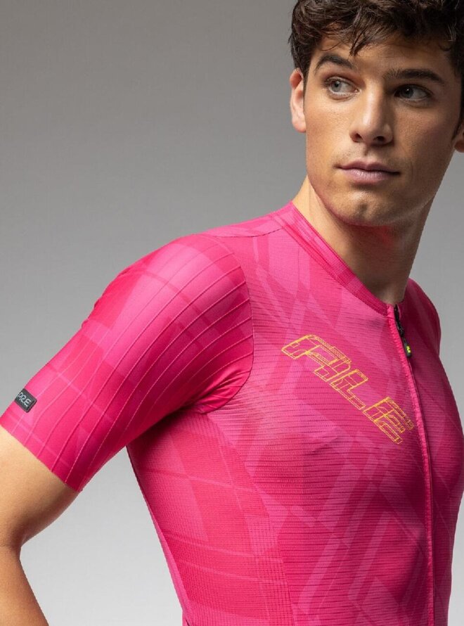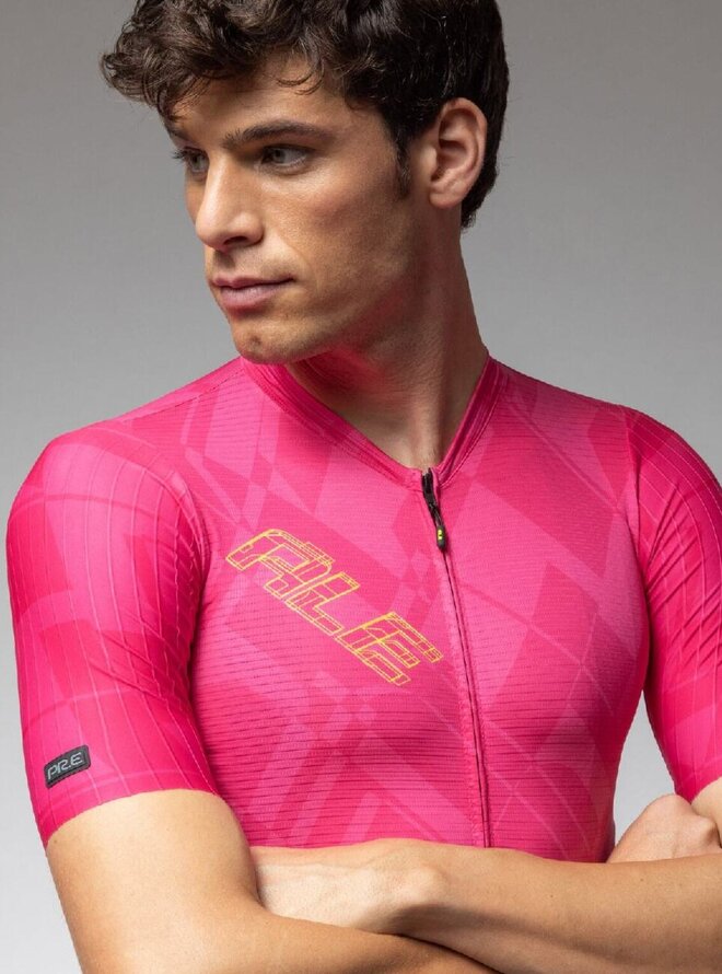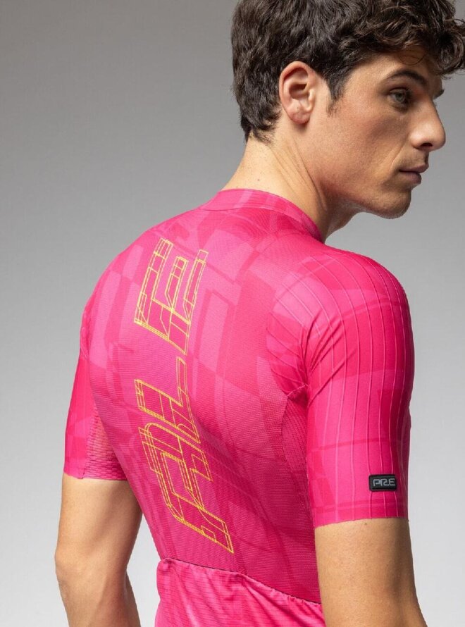 Każda część koszulki PR-E Schema została zaprojektowana tak, aby maksymalnie wykorzystać każdy zastosowany materiał. Wykonany jest z tkaniny Rap Dry Carbon z przeplatanymi włóknami węglowymi, ultralekkiej tkaniny Micro Aero zapewniającej cyrkulację powietrza i siateczki Piuma pod pachami zapewniającej oddychalność, co zapewnia najwyższy komfort i waży zaledwie 100 gramów. System S-Stability w dolnej przedniej części koszulki gwarantuje optymalne dopasowanie. Wszyte rękawy o kroju bez podszewki.