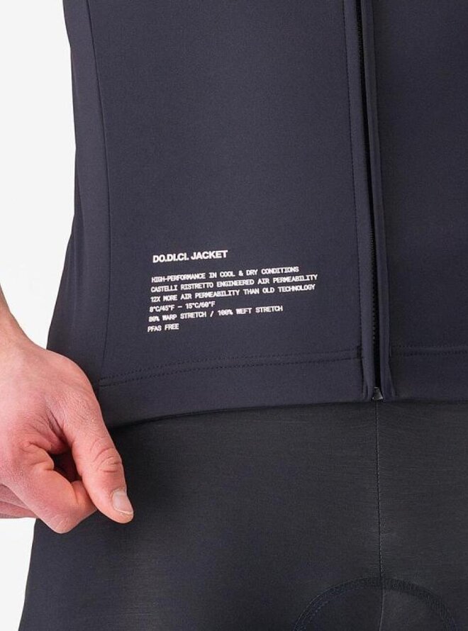 Sekret tkwi w technologii Castelli Ristretto. Podczas opracowywania uwzględniliśmy przepuszczalność powietrza i stworzyliśmy materiał, który jest odporny na wiatr, ale przepuszcza bardzo małą ilość powietrza przez tkaninę, umożliwiając lepsze odparowanie potu i zapewniając suchość. Ile dokładnie przepuszcza powietrze? DO.DI.CI. Po włosku oznacza „dwanaście”, ponieważ ta kurtka przepuszcza 12 razy więcej powietrza niż stara Gabba. To jak różnica pomiędzy suszeniem spodni rowerowych w zimnej i wilgotnej piwnicy, a w pomieszczeniu, w którym wieje lekki wietrzyk.