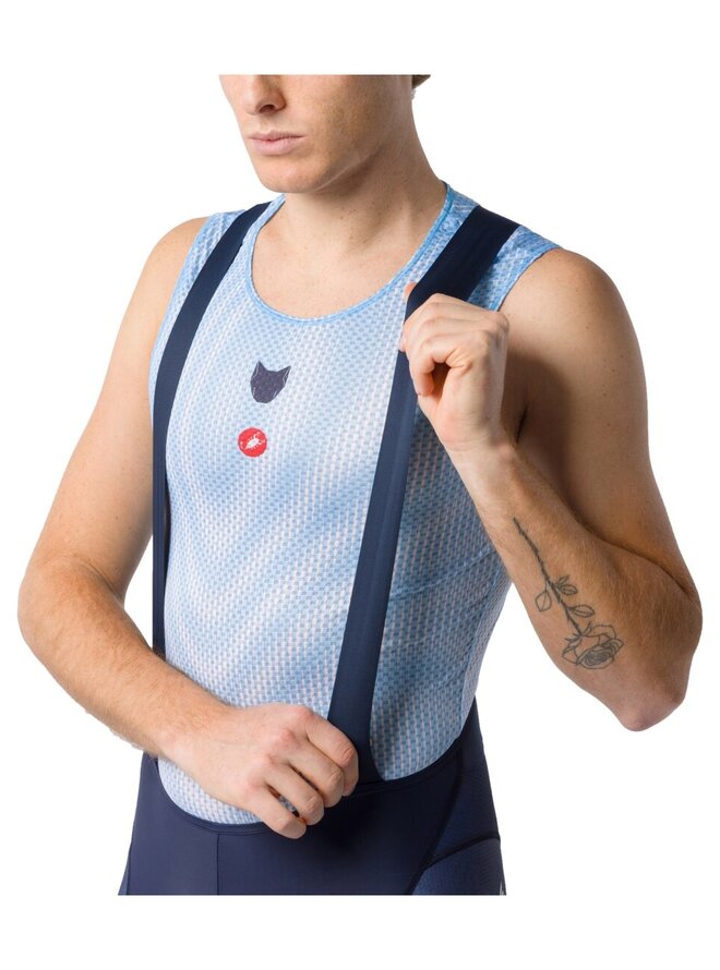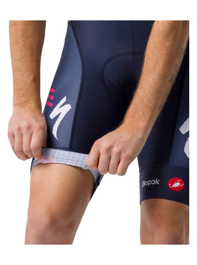 Szeroka, elastyczna końcówka spodni ze zintegrowanym silikonem gwarantuje wygodne i pewne trzymanie. Wkładka KISS Air2 zapewnia ten sam komfort, co topowe wkładki z najwyższych modeli, jednak z naciskiem na doskonały stosunek ceny do jakości. Castelli przeprojektował także paski: tył wykonano z oddychającej siateczki, natomiast same paski z lekkiego, elastycznego materiału zapewniają wygodę nawet po wielu godzinach spędzonych w siodle. Cechą nieuchwytną, ale niezwykle cenioną jest idealnie dopasowany krój, będący efektem pracy zespołu projektantów kroju Castelli.